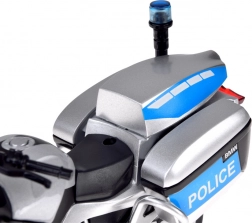 Ghidonul, oglinzile, parbrizul clar și cadranele imprimate fidel subliniază aspectul autentic al motocicletei de poliție.
