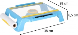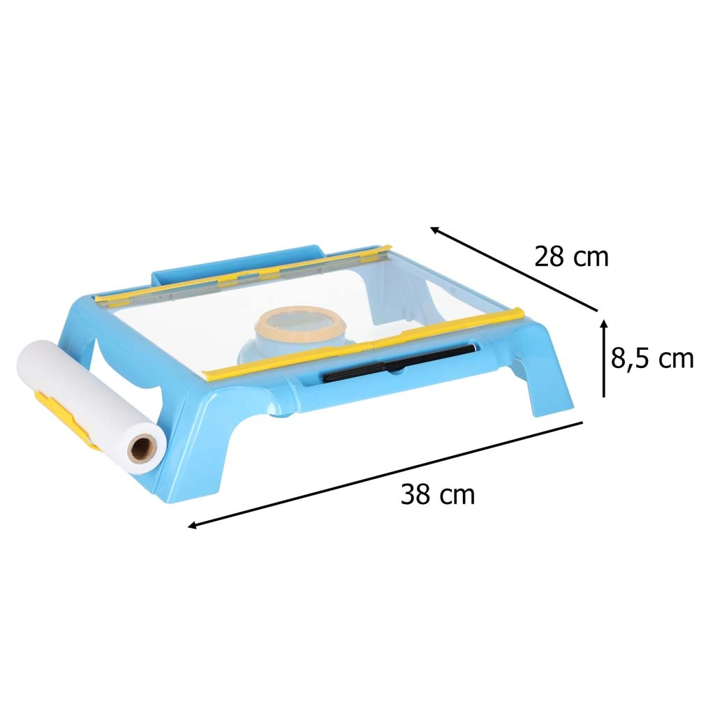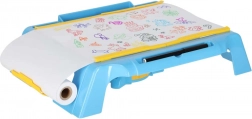 Baza stabilă din plastic, cu suprafață de lucru înclinată și suport pentru rolă de hârtie, oferă copiilor condiții confortabile pentru desen acasă și în călătorii.