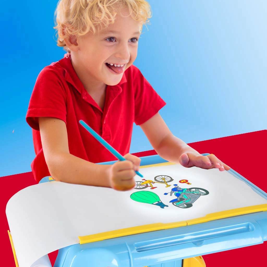 Acest proiector educațional proiectează imagini pe hârtie, astfel încât copiii pot contura cu ușurință și pot căpăta treptat siguranță în desen. Datorită focalizării ajustabile și măsuței stabile, lucrul este confortabil atât pe birou, cât și pe podea. Combinația albastru-galben este durabilă și sigură pentru micii artiști.
