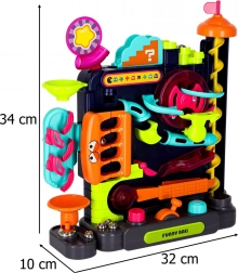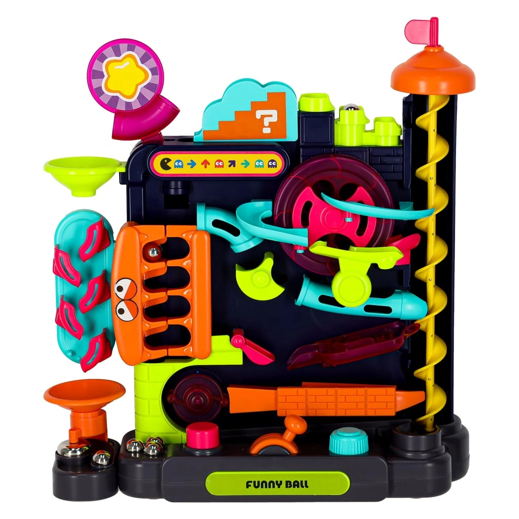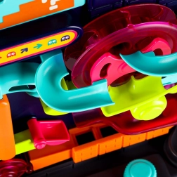 Această pistă colorată cu bile oferă copiilor de la 3 ani o aventură plină de rampe, spirale și elemente interactive. Controlați traseul cu ajutorul pârghiilor și al butoanelor rotative, urmăriți cum bilele depășesc obstacolele și exersați coordonarea și răbdarea. Ideală pentru joaca de acasă și pentru experimente fizice simple cu gravitația.