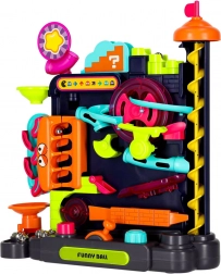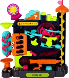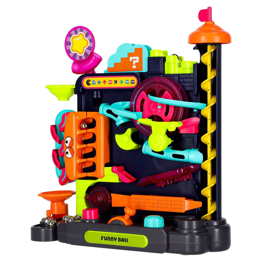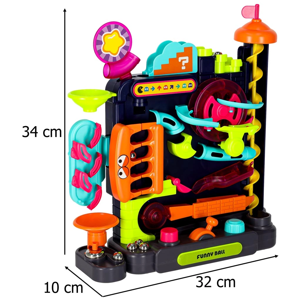 Descoperiți pista distractivă cu bile care dezvoltă motricitatea fină, coordonarea mână–ochi și principiul cauză–efect. Cu ajutorul pârghiilor, rotițelor și butioanelor ghidați bilele metalice pe un traseu plin de rampe, pâlnii și elemente rotative. Culorile vii și construcția rezistentă asigură joacă dinamică și durabilitate îndelungată.