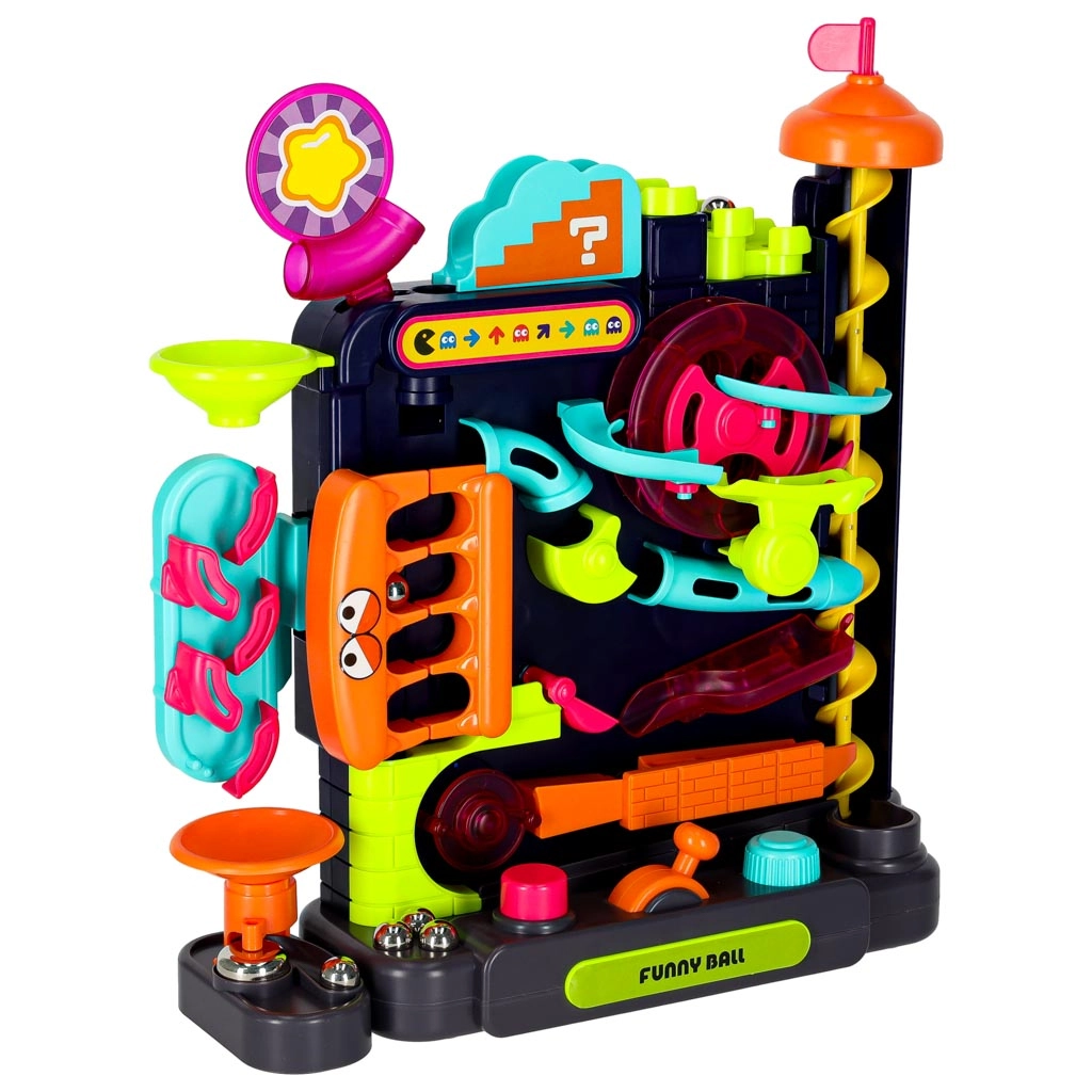 Datorită construcției robuste din plastic, bazei stabile și aranjării clare a traseelor, jocul este accesibil și pentru cei mai mici. Setul include 6 bile metalice, ușor de lansat și readus la start. Numeroasele rute și părți mobile stimulează creativitatea, gândirea logică și concentrarea.