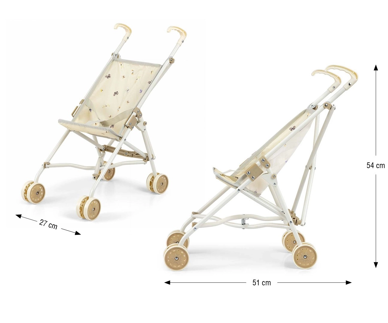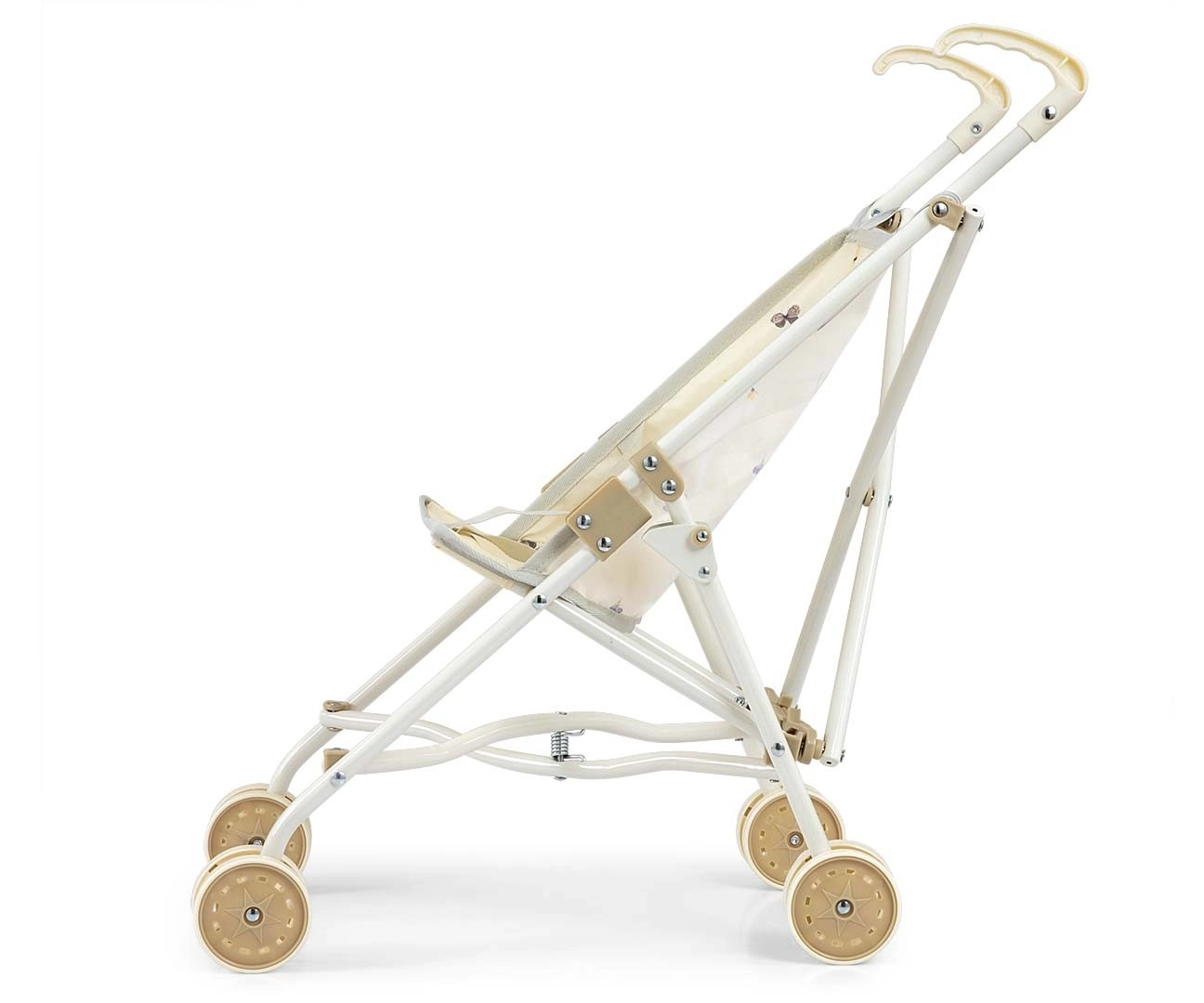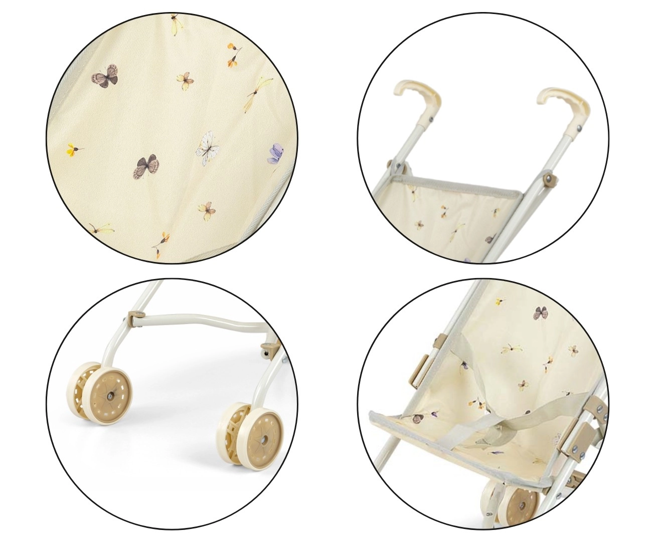 Datorită plierii rapide tip umbrelă, căruciorul se depozitează ușor, plat, astfel încât nu ocupă loc acasă sau în călătorii. Șasiul metalic oferă robustețe, roțile duble asigură rulare lină, iar centura de siguranță fixează păpușa în siguranță.