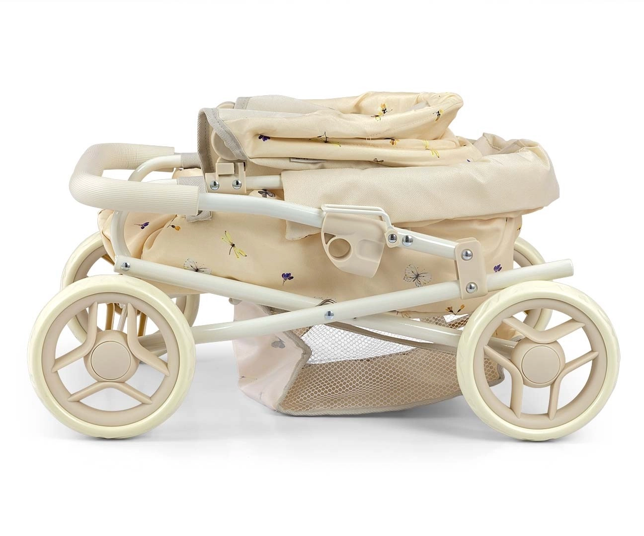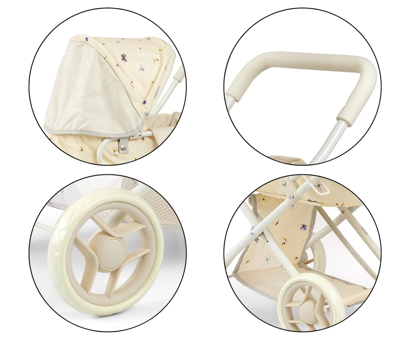 Construcția metalică robustă asigură stabilitate, în timp ce roțile din spumă rulează lin și sunt silențioase. Husa din poliester rezistent se poate scoate ușor și spăla. Coșul inferior din plasă găzduiește biberonul, hăinuțele și accesoriile, iar mânerul cu înveliș din spumă este plăcut la atingere.