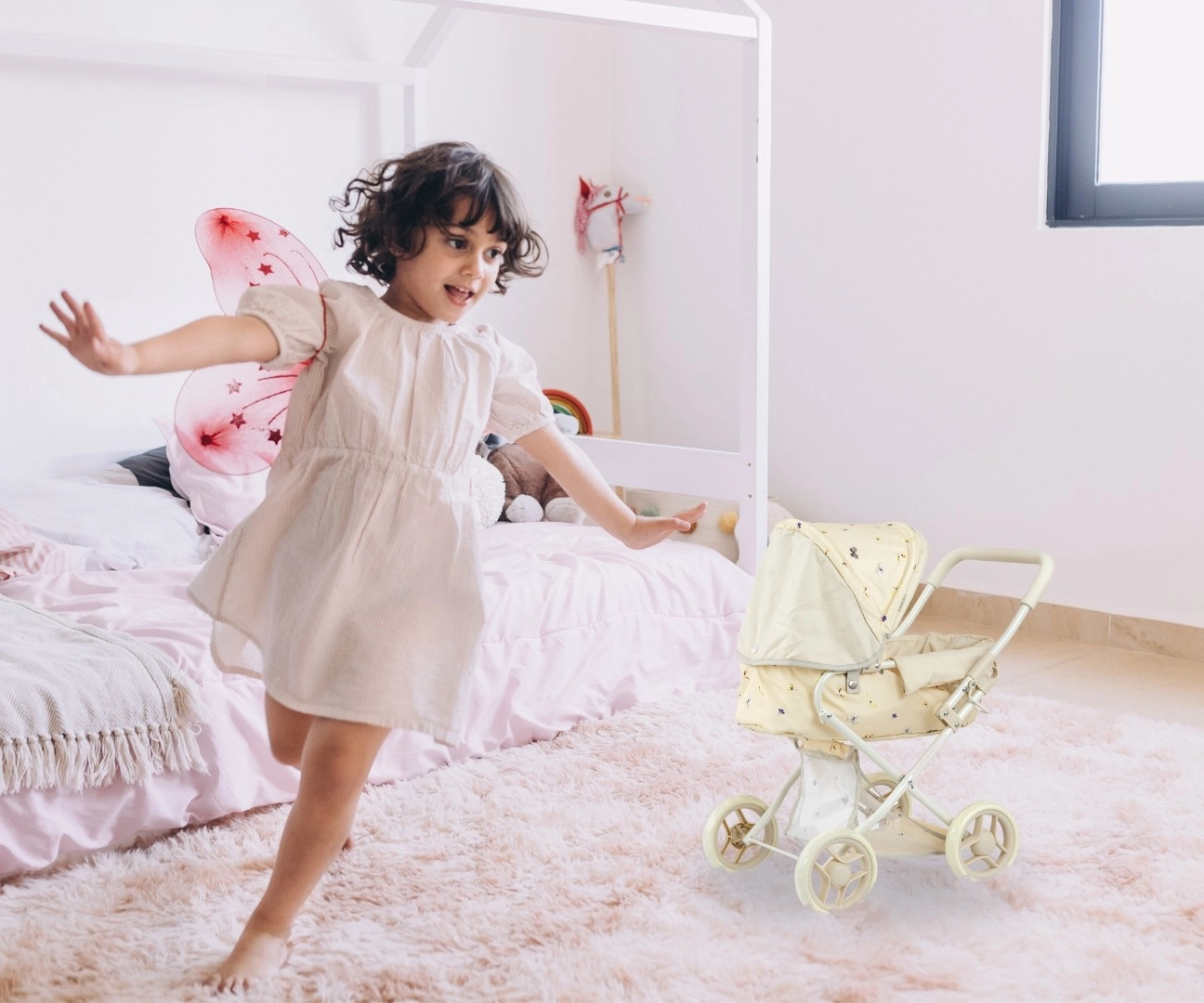 Pentru utilizare în siguranță, nu lipsește sistemul de blocare împotriva plierii accidentale. În pachet găsiți și perniță și plapumă asortate cromatic cu căruciorul – totul pregătit pentru jocul plin de imaginație.