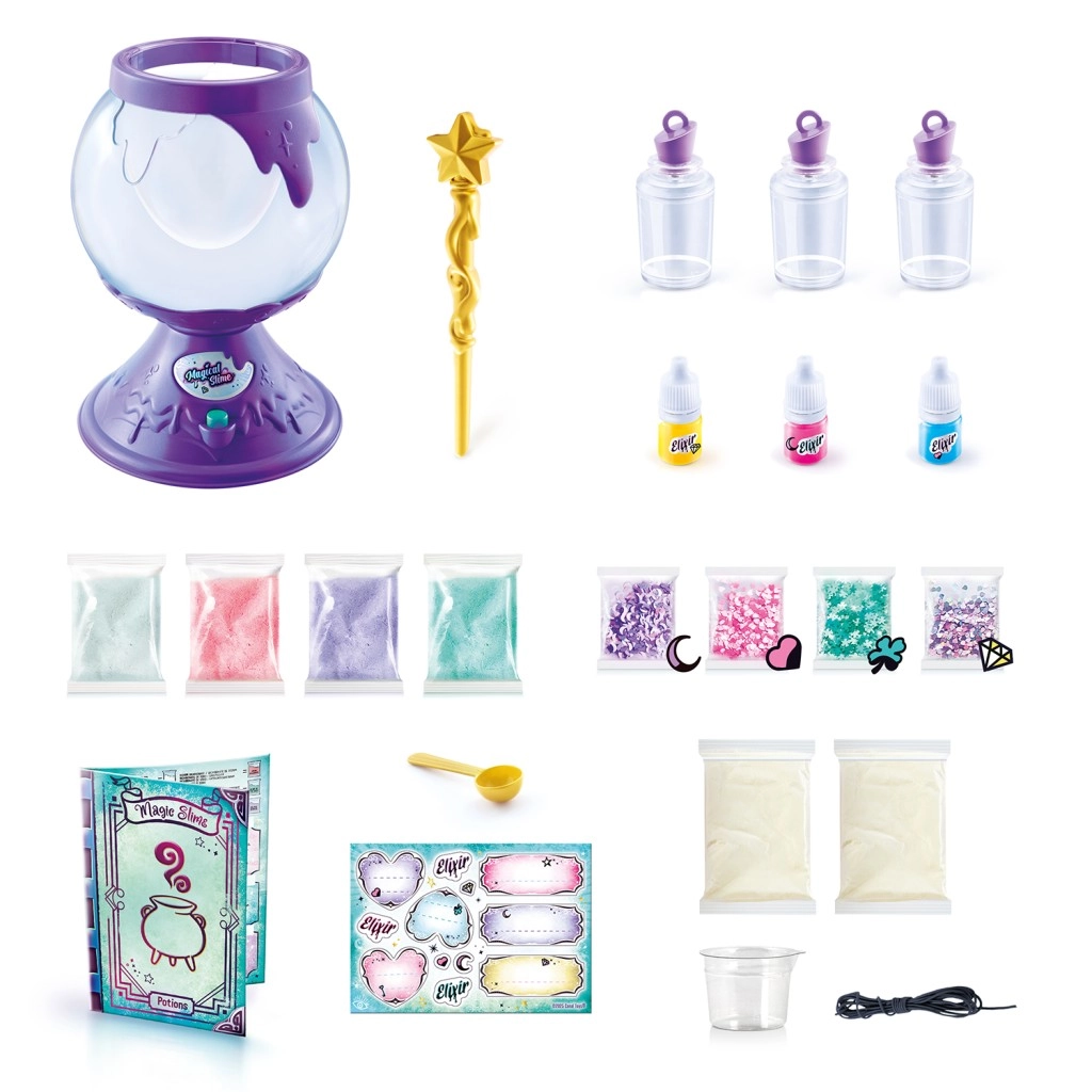 În pachet găsești pulberi pentru slime, 3 elixire, 4 decorațiuni, un pahar gradat, rețete și 3 sticluțe – tot ce au nevoie copiii pentru propriile lor amestecuri magice.
