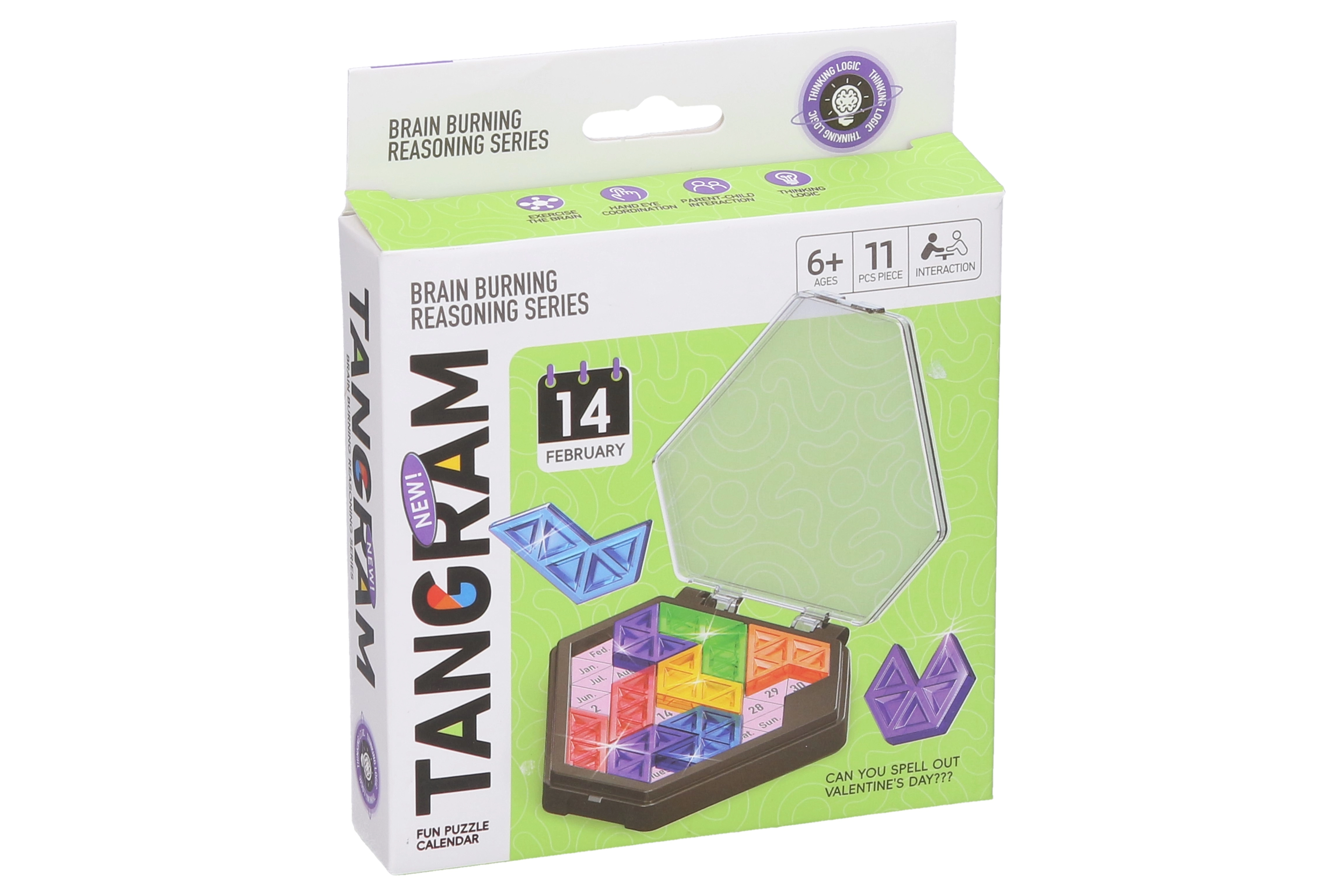 Tangram puzzle 10 cm este ideal pentru copii și adulți care iubesc provocările inteligente. Cu șabloanele incluse poți compune nu doar forme clasice, ci și modele originale cu teme de sărbători și ocazii speciale. Sarcina este clară: aranjează piesele astfel încât să rămână vizibile doar data și ziua săptămânii.