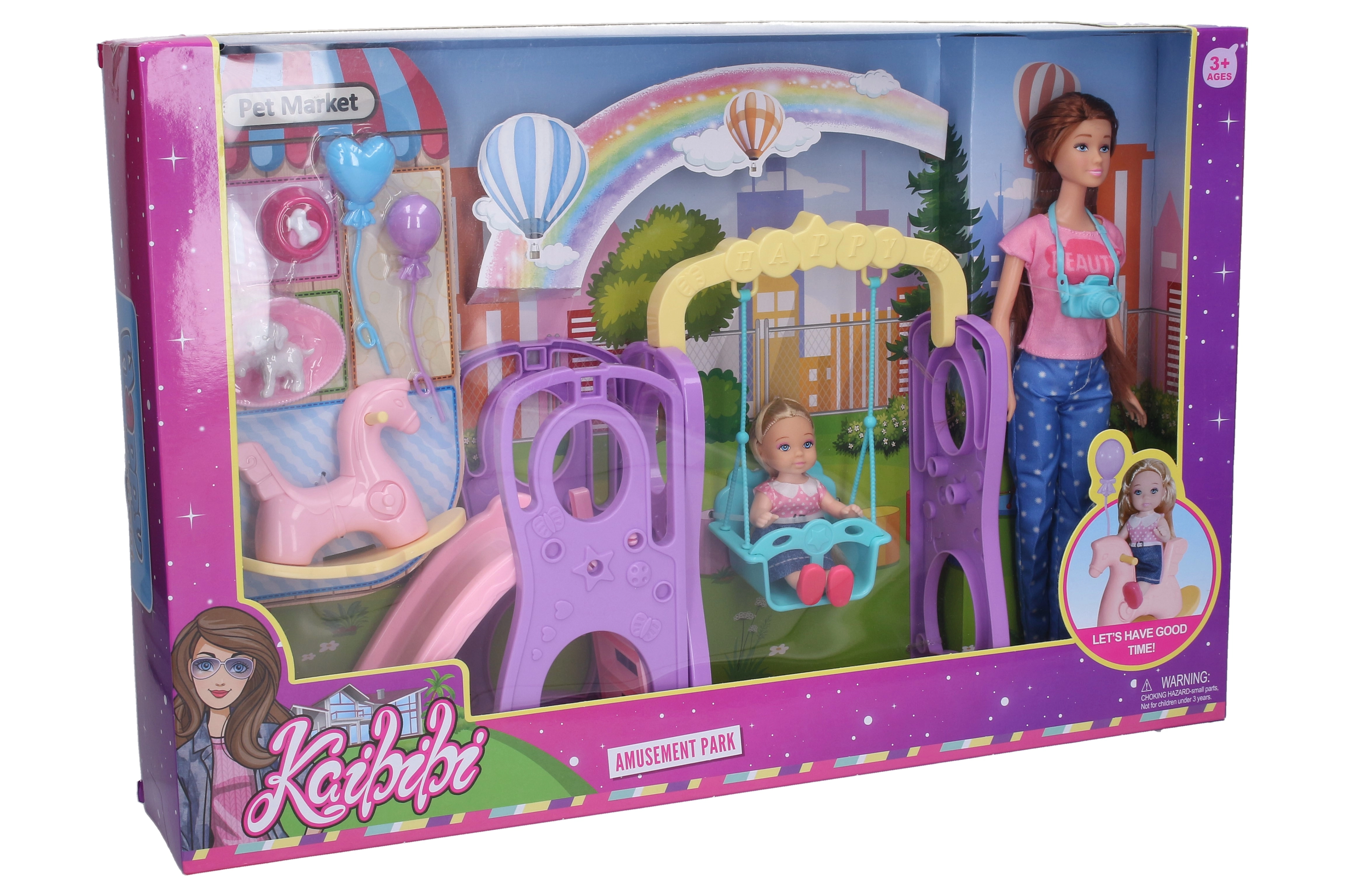 - Păpușă, fetiță, leagăn, tobogan, căluț balansoar, cățeluș și accesorii
