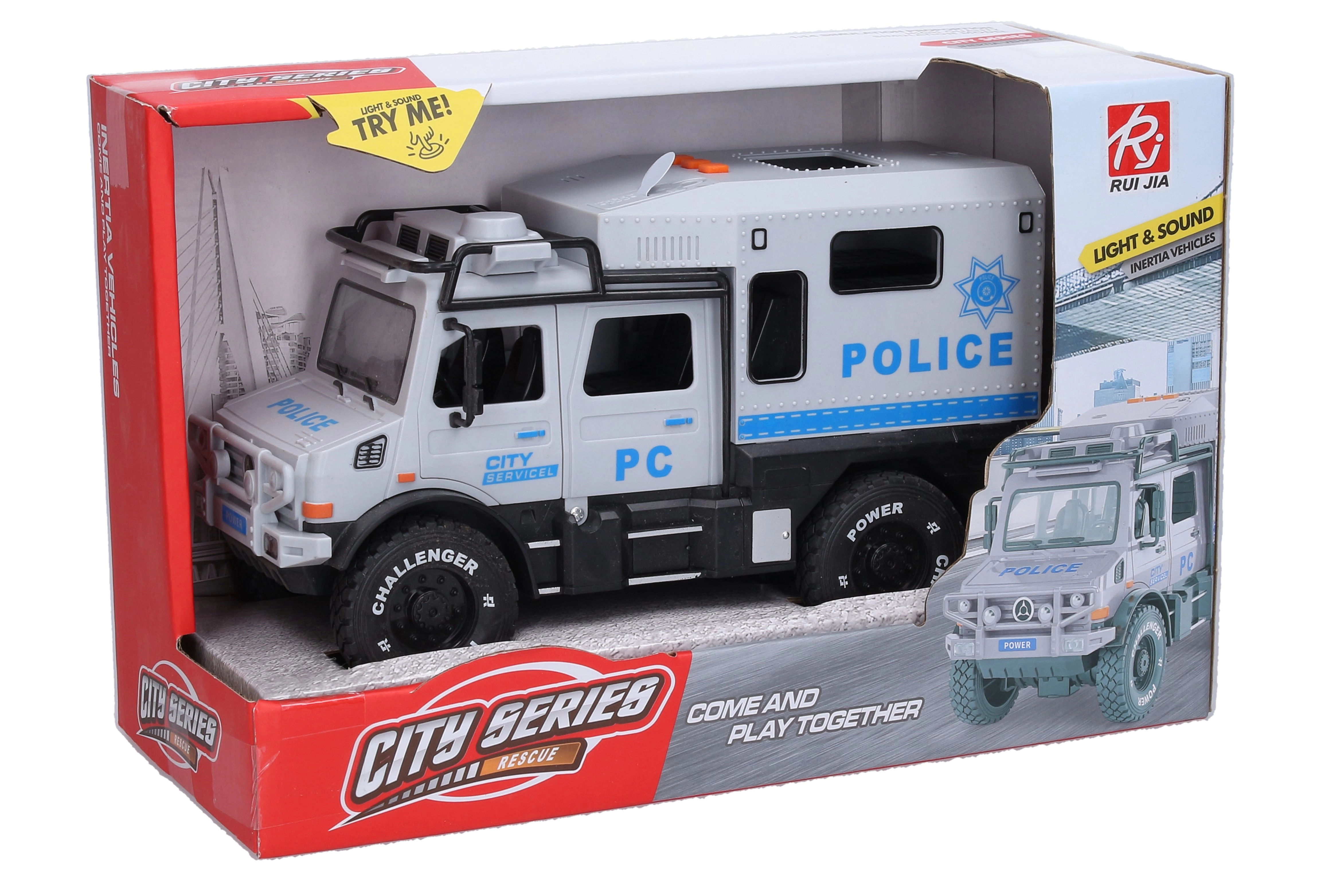 Pornește în misiune cu mașina blindată de poliție, care impresionează prin detalii și funcții numeroase. Datorită mecanismului pe inerție, vehiculul pornește după o împingere, iar datorită efectelor copiii se vor bucura de un joc și mai realist.