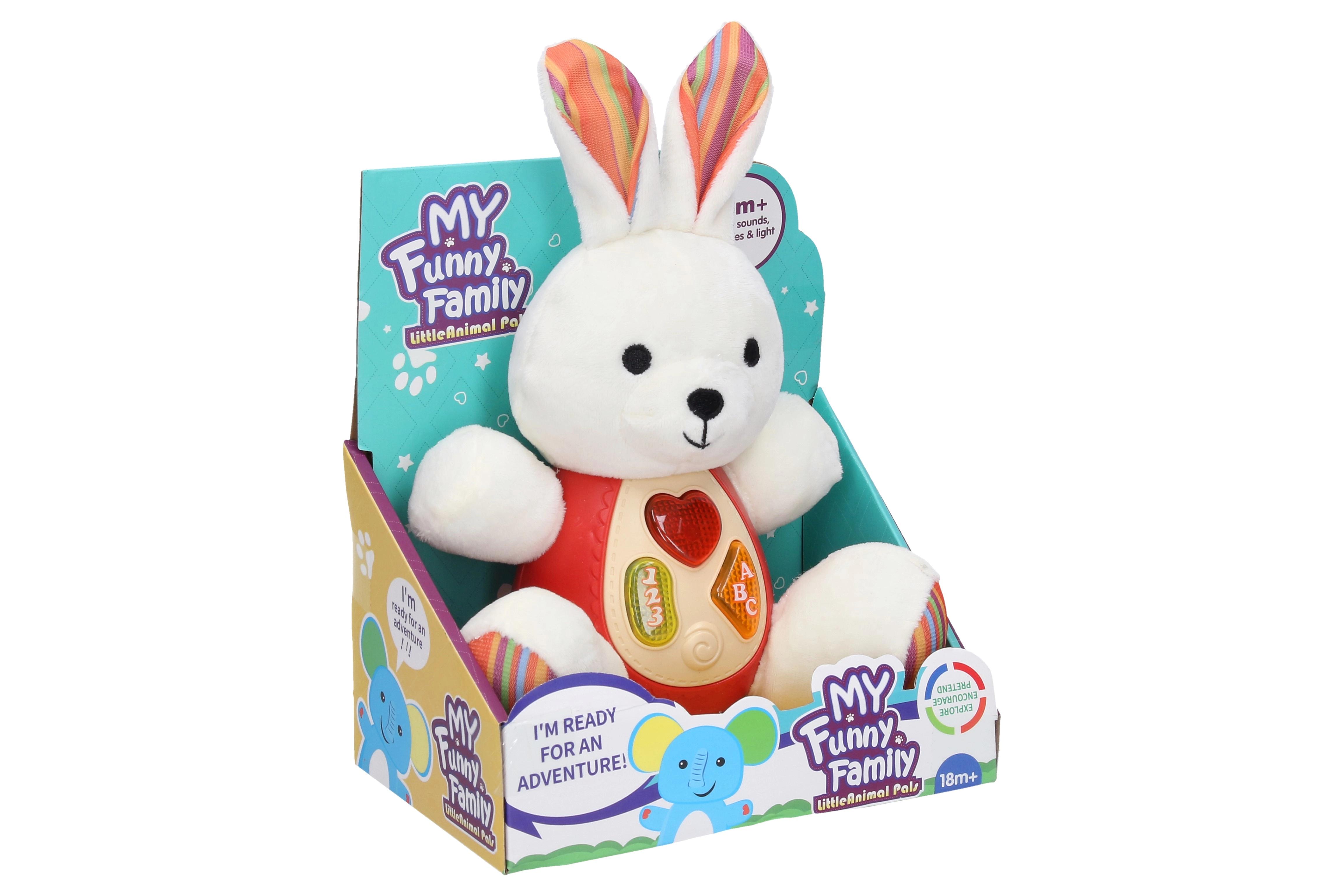Acest iepuraș interactiv, foarte moale, este un prieten grozav pentru primele descoperiri ale sunetelor și luminilor. Combină un înveliș din pluș plăcut cu o burtică din plastic rezistentă, pe care copiii pot activa cu ușurință melodii, sunete și efecte luminoase. Datorită dimensiunilor compacte, se ține confortabil în mână și este ideal pentru joacă acasă sau în călătorii.