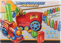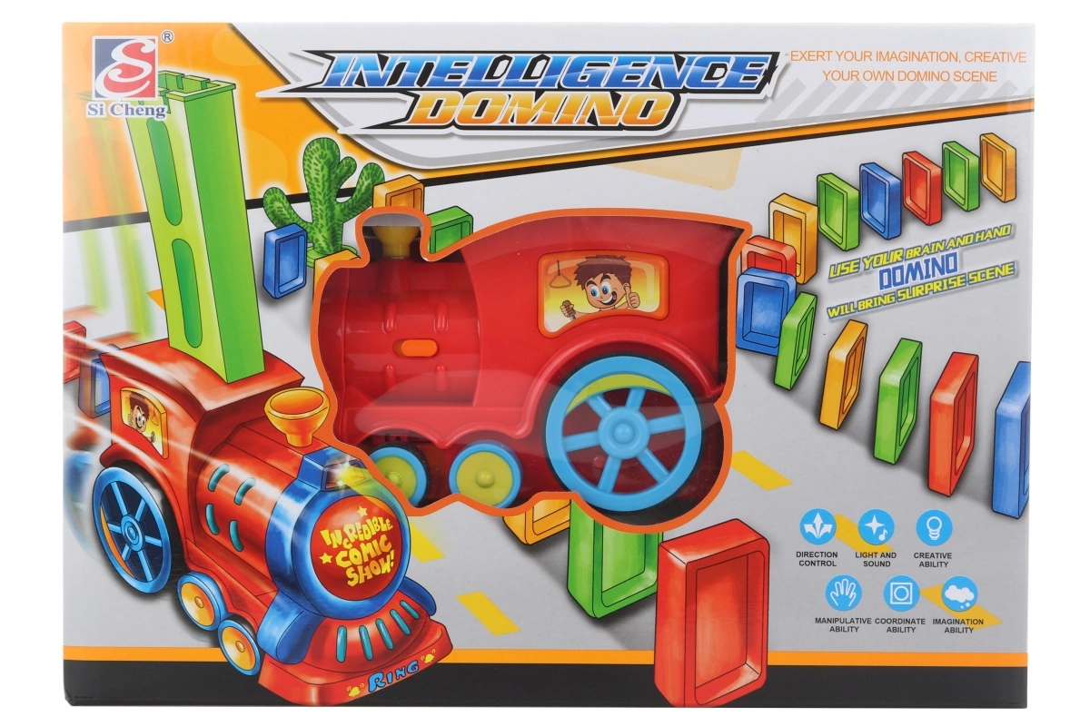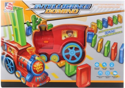 Acest trenuleț roșu de domino este o jucărie ideală pentru micii constructori. După montarea încărcătorului cu piese de domino, trenulețul, în timpul mersului, eliberează automat piesele și le așază în linie dreaptă. Jocul este însoțit de lumini și clinchet, făcându-l și mai distractiv. La lovirea unui obstacol, trenulețul își schimbă direcția și își continuă deplasarea.