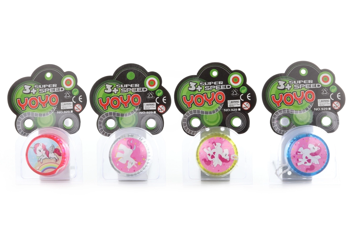 Yo-yo din plastic distractiv cu motiv unicorn, care la rotire se luminează și atrage atenția copiilor și adulților. Ideal pentru exersarea abilităților și a motricității fine, alimentat de 2 baterii tip pastilă. Dimensiuni compacte aprox. 5,5 × 5,5 × 3 cm, recomandat pentru copii de la 3 ani.
