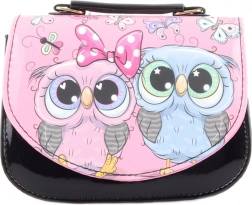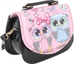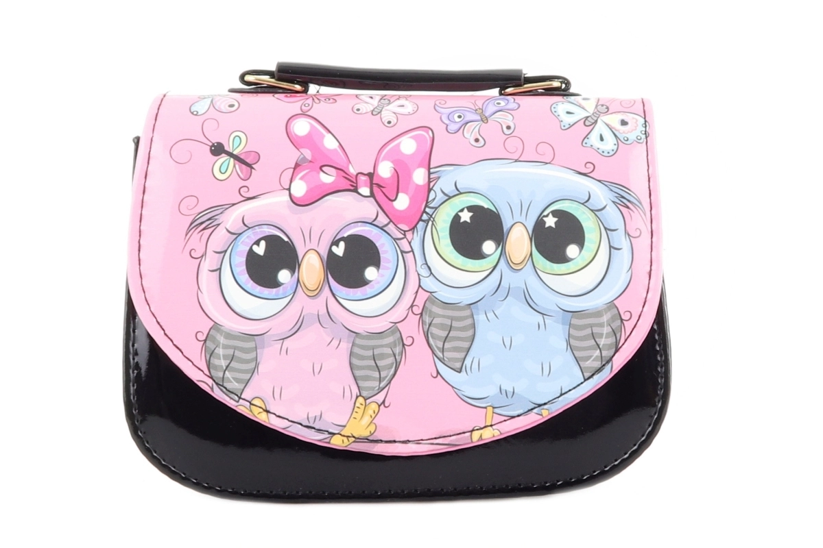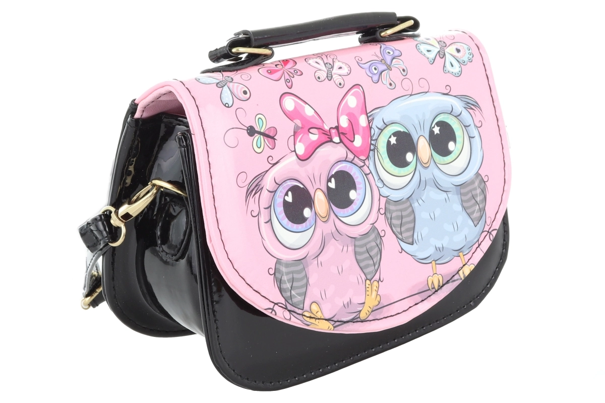 Această poșetă pentru copii, în culoare neagră elegantă, cu imprimeu vesel de bufnițe, este grozavă pentru a purta mărunțișuri precum șervețele, mici comori sau un portofel mic. Partea inferioară lucioasă și clapeta colorată, cu detalii drăgălașe, atrag atenția și îi vor încânta pe cei mici.