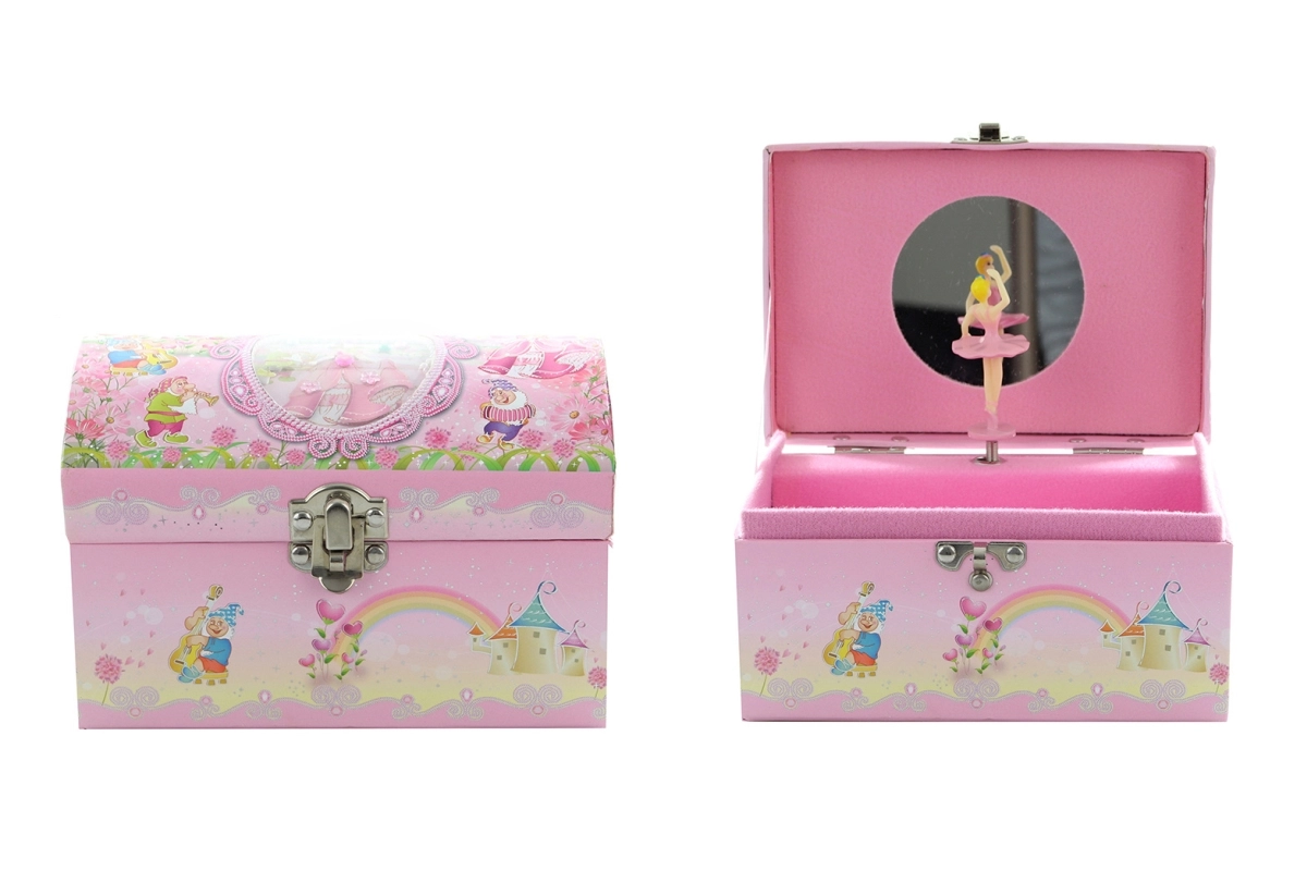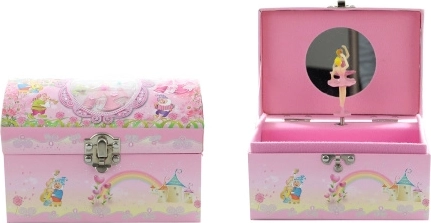 Elegantă cutie muzicală pentru bijuterii în formă de cufăr, pentru depozitarea stilată a bijuteriilor. După întoarcerea cheiței, balerina din interior începe să se învârtă și se aude o melodie. În interior găsiți o oglindă practică și spațiu pentru mărunțișuri. Design romantic, balerină dansatoare și mecanism muzical care vor încânta orice iubitoare de accesorii frumoase.