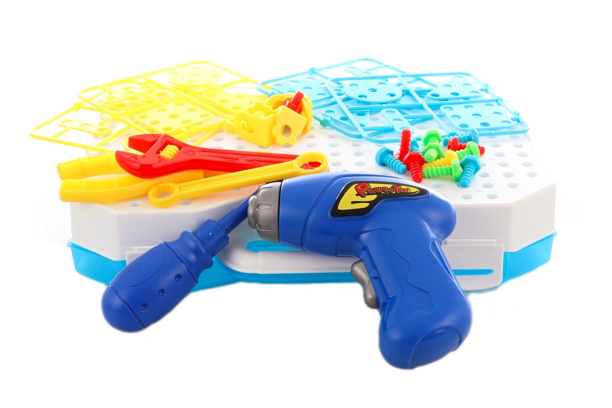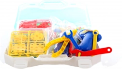 Acest set versatil oferă o gamă bogată de piese și unelte, cu care copiii se vor bucura de ore întregi de distracție cu sens. Bormașina pentru copii, pe baterii, ușurează înșurubarea și le apropie, în siguranță, de lumea uneltelor reale. Totul este depozitat într-o valiză din plastic rezistent, care facilitează transportul și organizarea.