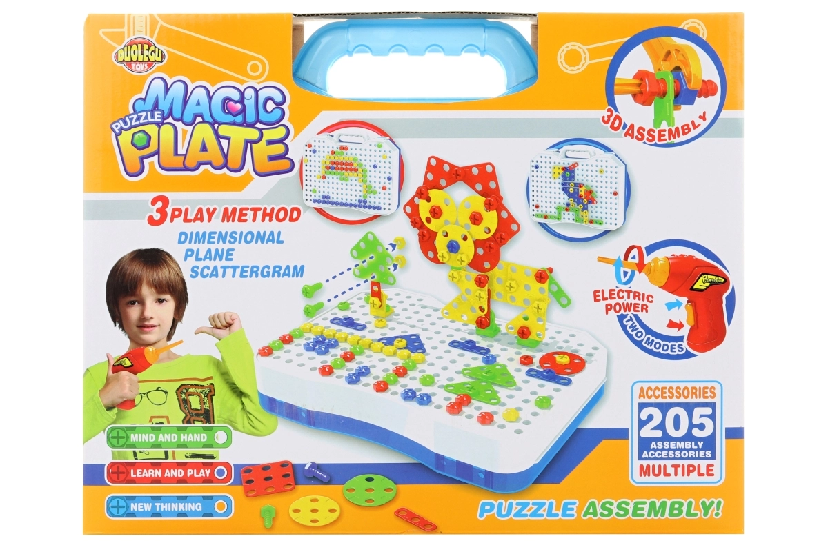 Distractiv și creativ, setul de construcție cu șuruburi cu bormașină pentru copii funcțională, într-o valiză practică, îi va încânta pe micii constructori de la 3 ani în sus. Pachetul conține 205 piese, unelte și instrucțiuni, astfel încât copiii își pot dezvolta motricitatea fină, gândirea logică și creativitatea construind nenumărate modele.