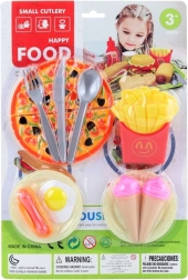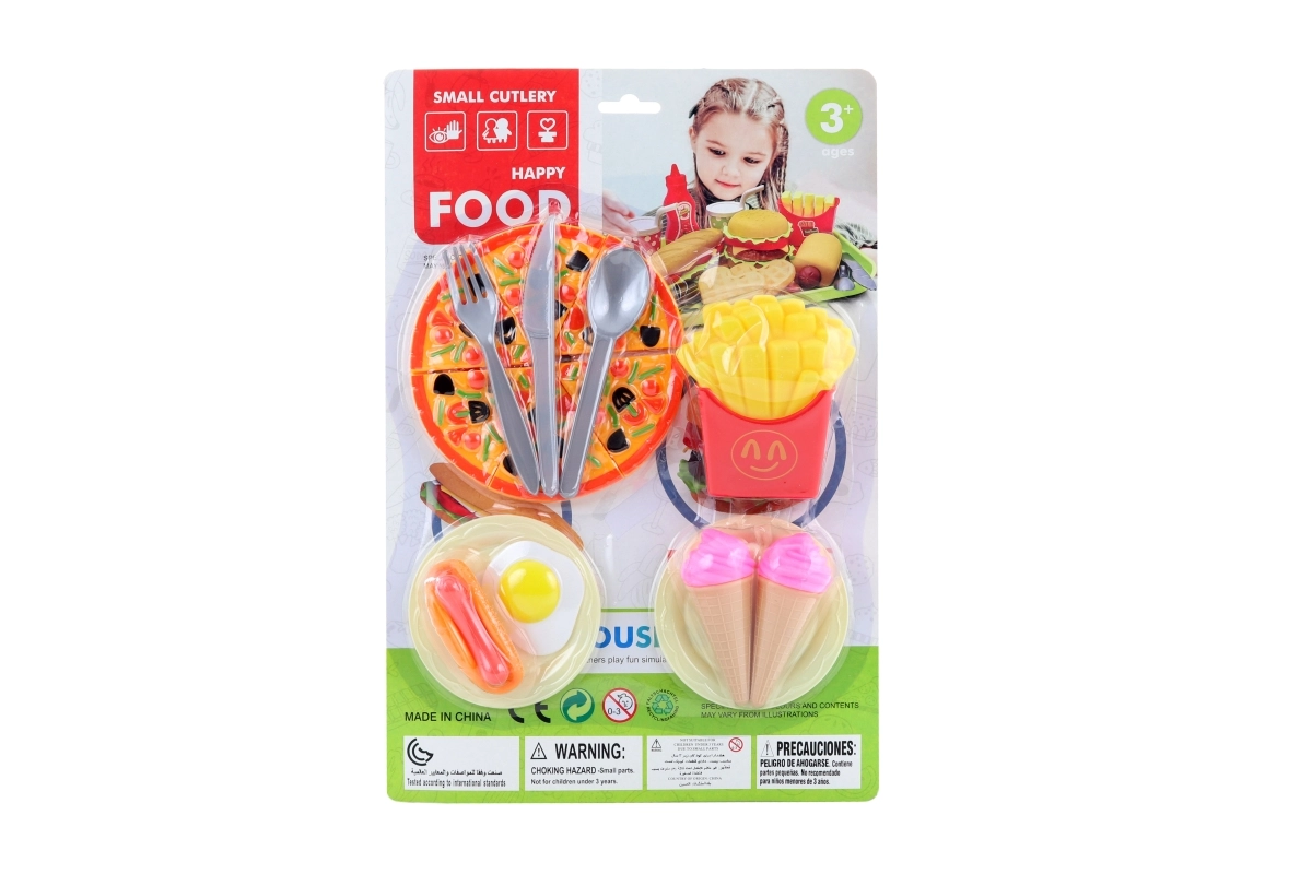 - Conținutul setului: pizza pe felii, cartofi prăjiți în cutie, hot dog, ou ochi, 2 înghețate, 2 farfurii, tacâmuri