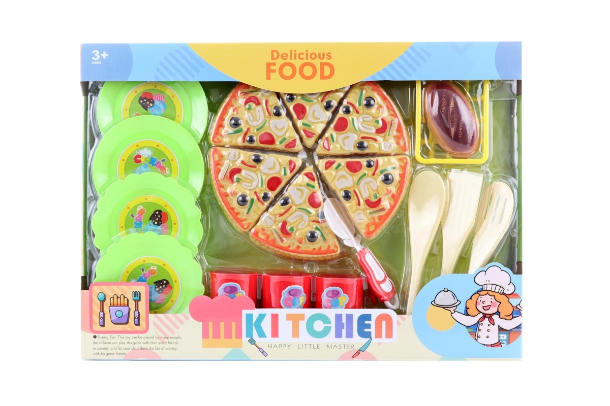 Set distractiv pentru micii bucătari: pizza din plastic împărțită în 6 felii cu farfurii, căni și ustensile pentru pregătire și servire. Ideal pentru jocul de-a bucătăria, susține creativitatea, jocul în grup și motricitatea fină. Ambalat în cutie, potrivit pentru copii de la 3 ani.