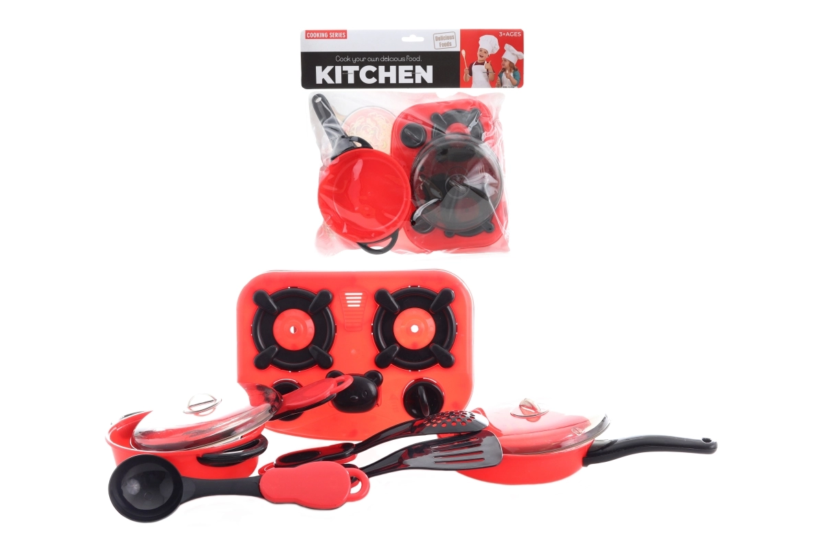 Set de joacă pentru bucătăria copiilor, pentru micii bucătari și bucătărese. Include un aragaz, oală, tigaie și paletă. Jucărie ușoară și sigură pentru copii de la 3 ani, ambalată practic în săculeț.