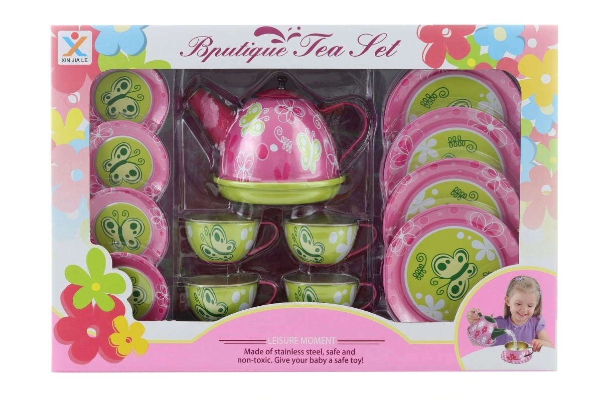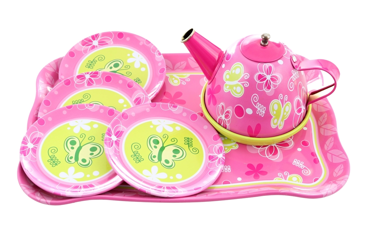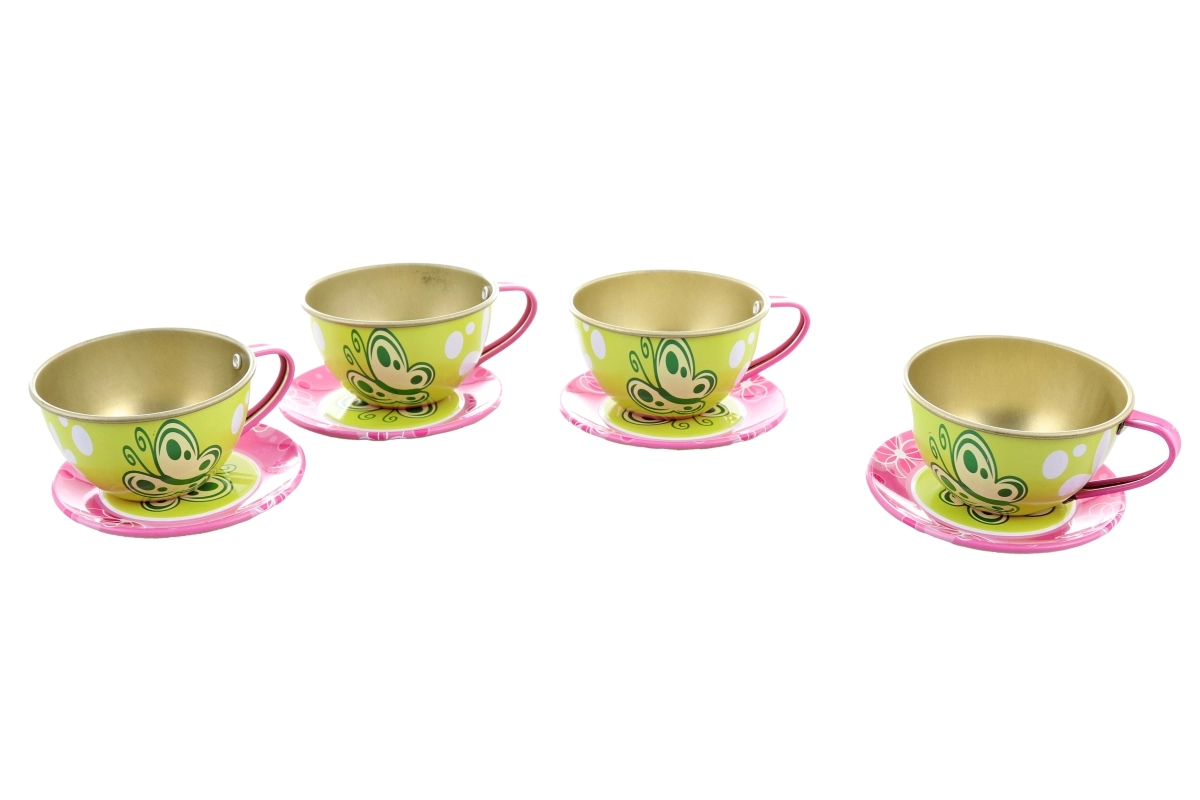 Un set de ceai fermecător din tablă, cu motiv de fluturi, care va încânta orice mică gazdă. Conține o ceainică, 4 cești, 4 farfuriuțe și 4 farfurii pentru joaca de-a ceaiul. Cadoul ideal pentru copii de la 3 ani.