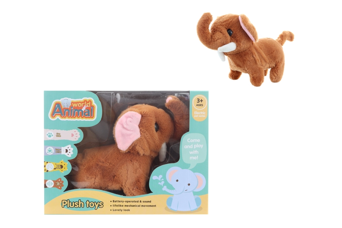Un elefant drăguț, care merge, pentru copii de la 3 ani aduce multă distracție. După introducerea a 2 baterii AA, începe să se miște și emite sunete autentice de trompetat. Combinația de plastic și pluș este rezistentă și plăcută la atingere. Mers, sunete de elefant și operare ușoară pe baterii vor încânta orice mic iubitor de animale.