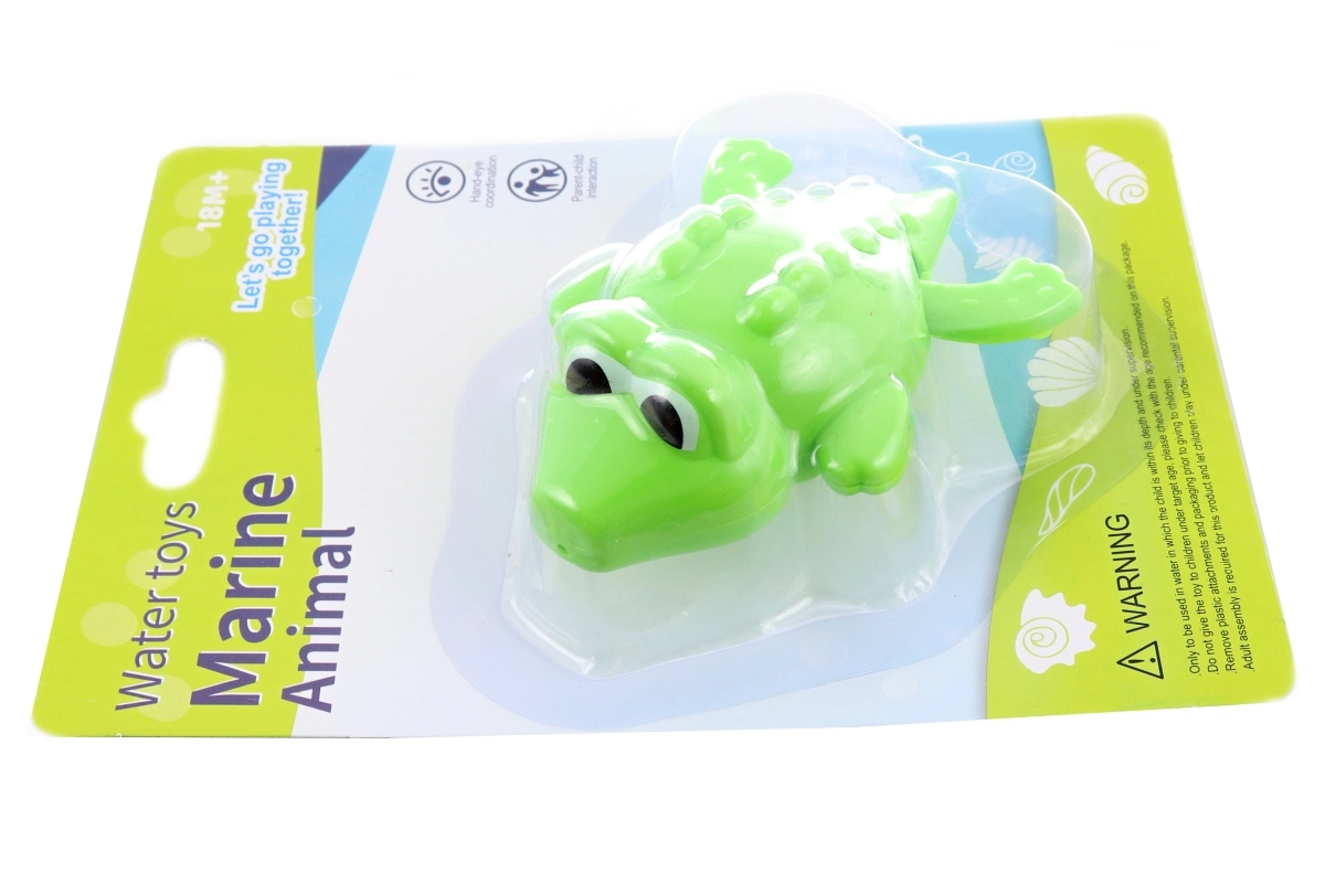 Jucărie de baie amuzantă pentru cei mici – crocodil din plastic cu mecanism de întoarcere, care după armare înoată singur. Ideal pentru dezvoltarea motricității, distracție sigură în apă și băi jucăușe începând de la 18 luni.