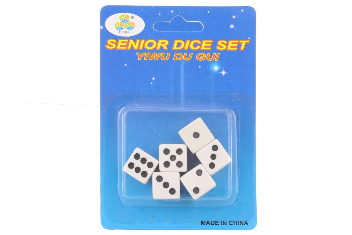 Set practic de zaruri în ambalaj tip blister, conține 6 zaruri din plastic cu dimensiunea de aproximativ 1,5 cm. Ambalajul compact (aprox. 9 × 12,5 cm) este ideal pentru călătorii, seturi de jocuri de acasă sau ca zaruri de rezervă.