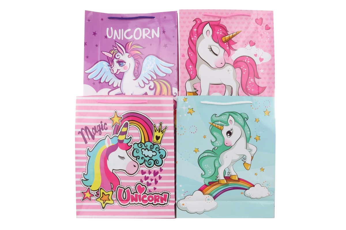 Pungă cadou stilată cu un motiv magic de unicorn pentru orice ocazie. Ideală pentru împachetarea cadourilor de zi de naștere și de sărbători. Datorită dimensiunilor de aproximativ 32 × 26 × 9 cm, acomodează confortabil diverse tipuri de cadouri și arată elegant și jucăuș.