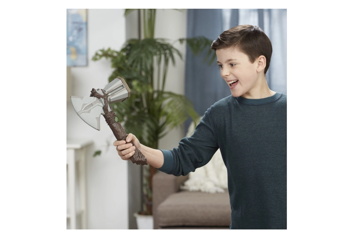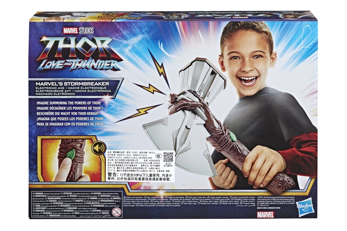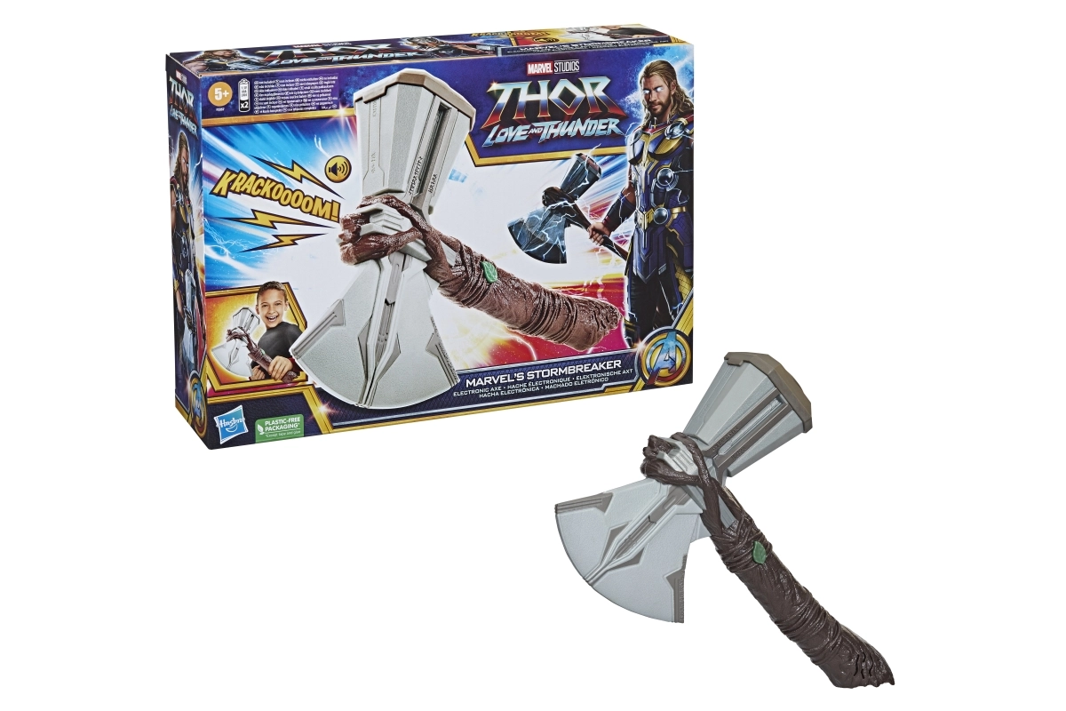 Devino erou ca Thor cu iconica secure Stormbreaker, inspirată de filmul Thor: Love and Thunder. Această jucărie redă efecte sonore realiste de furtună și tunete, activate prin butonul în formă de frunză. Este realizată din plastic de calitate, potrivită pentru copii de la 5 ani și funcționează cu 2× baterii AAA (incluse în pachet).