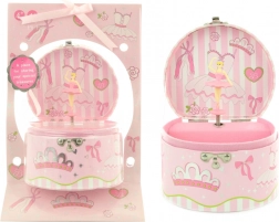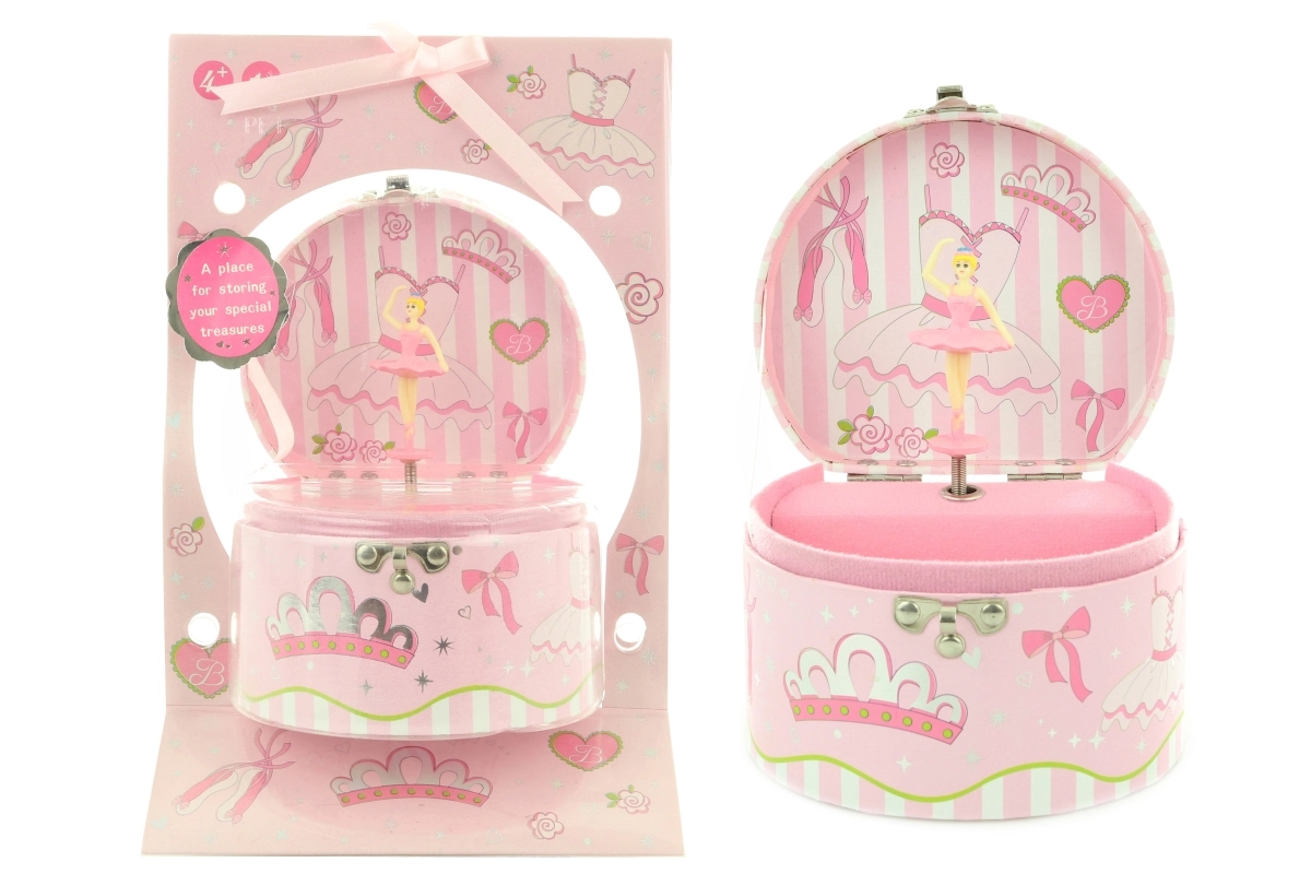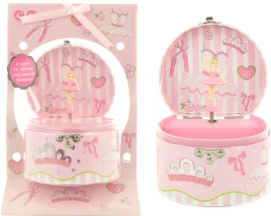 Această elegantă cutie muzicală pentru bijuterii cu balerină oferă locul ideal pentru depozitarea inelelor, brățărilor și altor mărunțișuri. La deschiderea capacului și întoarcerea cheiței, balerina începe să danseze grațios în fața oglinzii și se aude o muzică plăcută. Datorită dimensiunilor compacte, cutia pentru bijuterii încape ușor pe noptieră sau pe un raft în camera copilului.