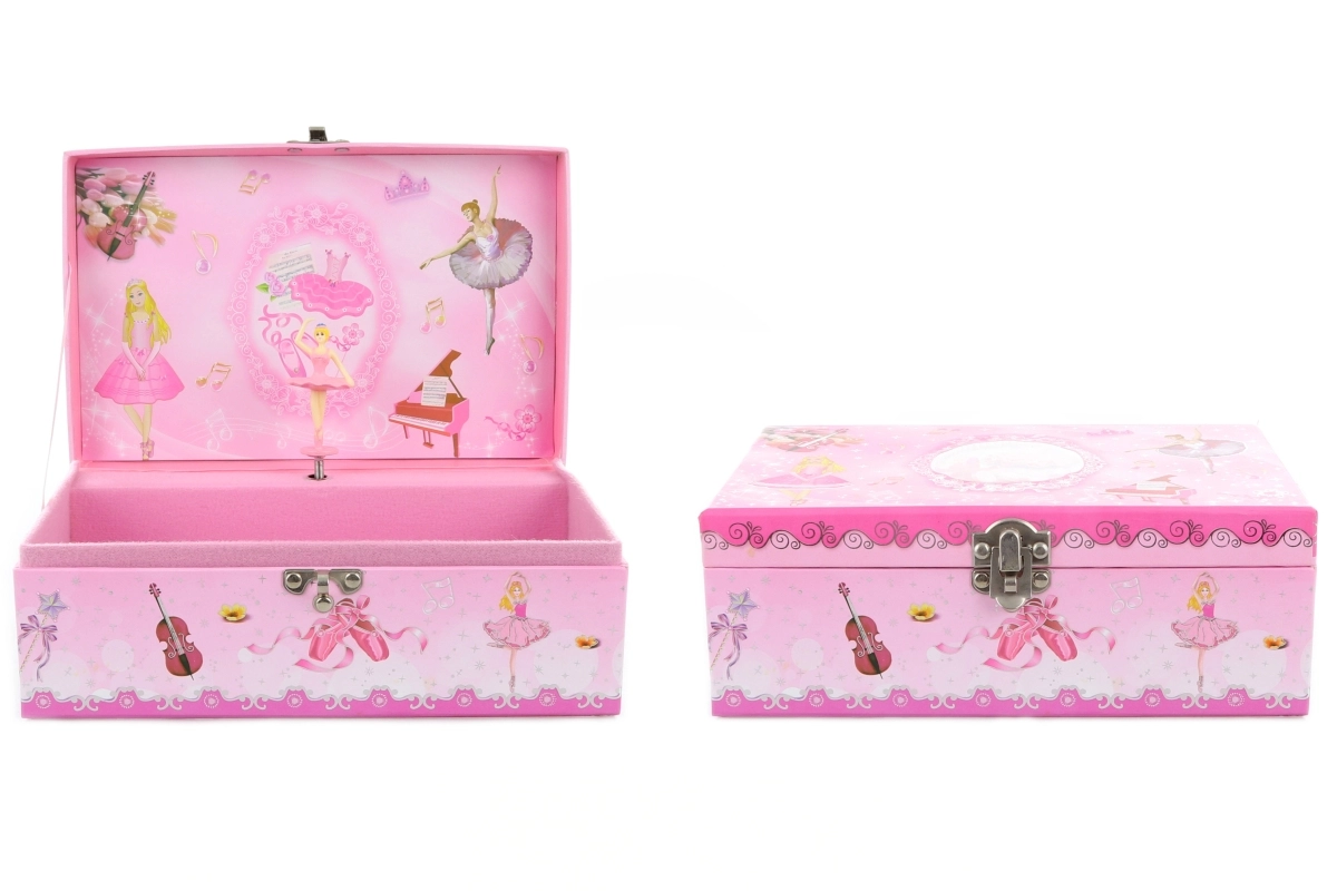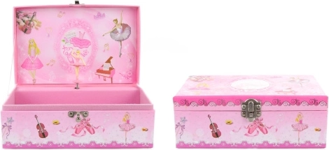 O fermecătoare cutie muzicală pentru bijuterii cu balerină va bucura orice mică domnișoară. După învârtirea cheiței, balerina din interior începe să se rotească și se aude o melodie delicată. În interior găsiți o oglindă practică și spațiu pentru mici comori. Un cadou ideal pentru copii de la 3 ani, care stimulează imaginația și bucuria de a păstra bijuteriile în ordine. Mecanism muzical, balerină dansatoare, oglindă și spațiu generos pentru bijuterii într-un singur produs.