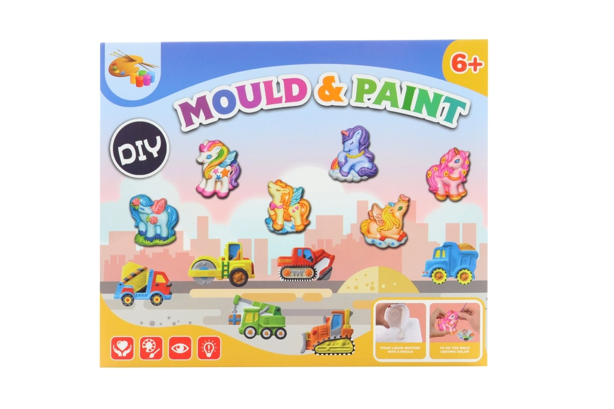 - Set complet – ghips, matriță cu 6 motive, 8 culori, 2 pensule și accesorii