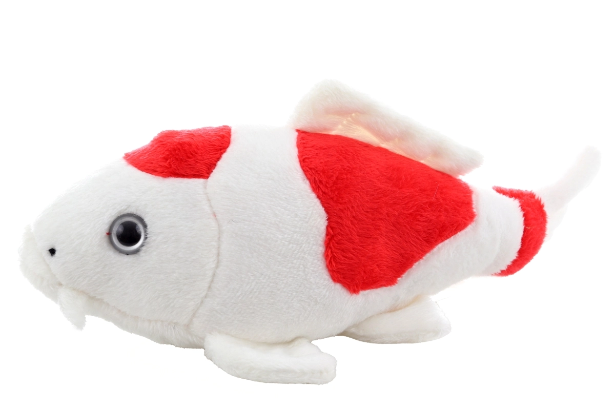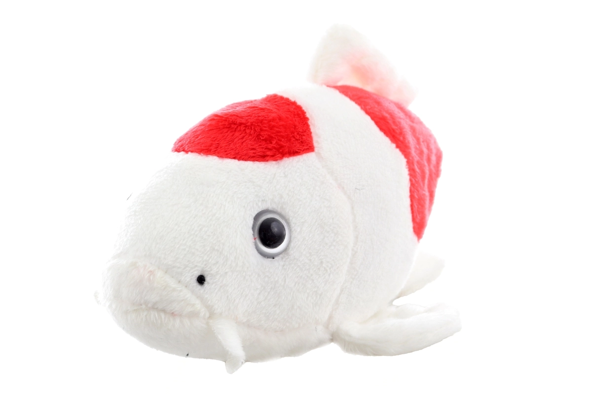 Acest crap koi de pluș catifelat, în variantă alb-roșie, îi va încânta pe toți copiii și pe iubitorii de animale. Este plăcut de moale, ușor și se potrivește perfect în mână, fiind ideal pentru alintat, joacă și liniștire înainte de somn.