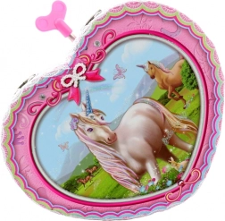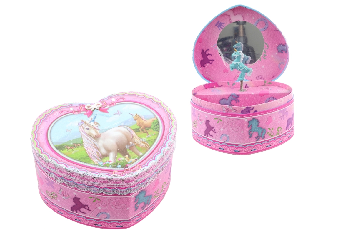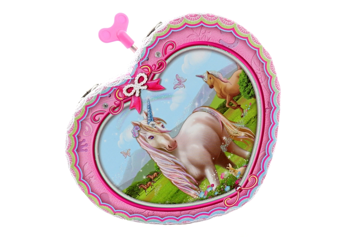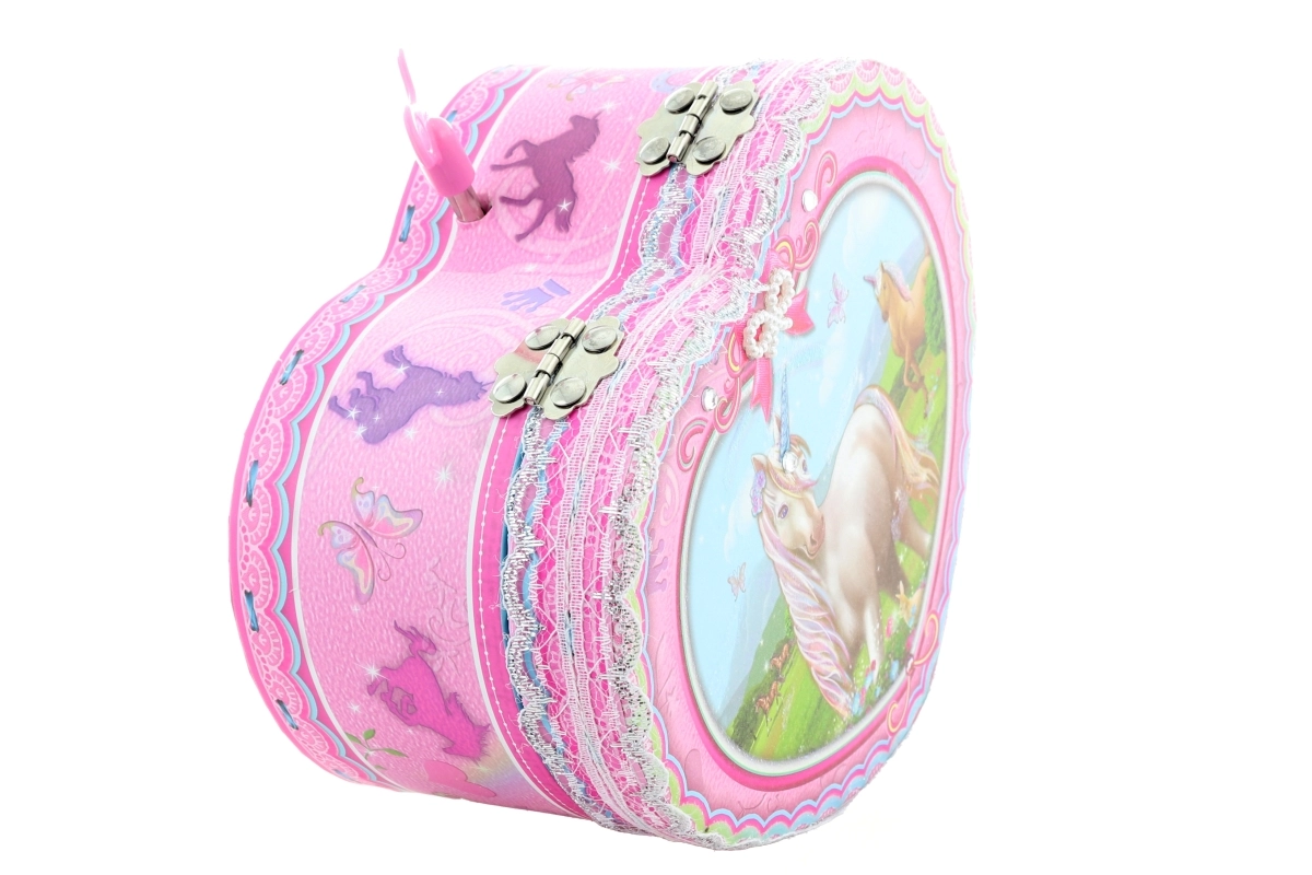 Această încântătoare cutie muzicală de bijuterii, în formă de inimă, impresionează prin designul roz cu unicorn și detalii decorative fine. După învârtirea cheiței, la deschiderea capacului, balerina se rotește în fața oglinzii și începe o melodie care creează o atmosferă magică la fiecare așezare a bijuteriilor.