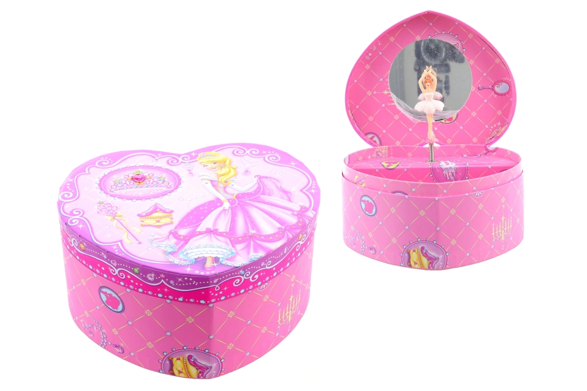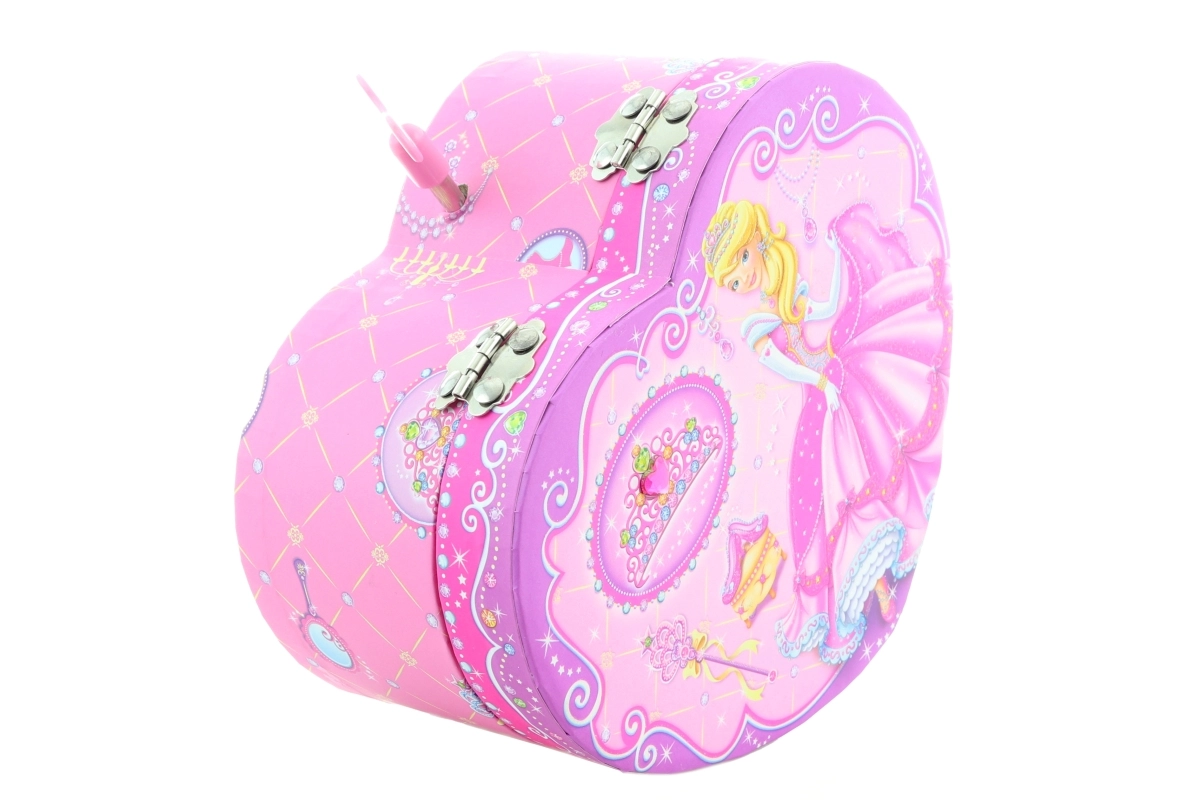 Această cutie muzicală de bijuterii, în formă de inimă, cu motiv de prințesă, va încânta orice iubitoare de accesorii. După întoarcerea cheiței, în interior pornește o balerină dansatoare și se aude o melodie delicată. Oglinda practică, depozitarea sigură a mărunțișurilor și designul adorabil fac din această cutie de bijuterii un accesoriu ideal pentru camera copiilor.