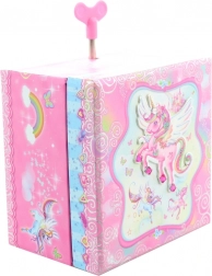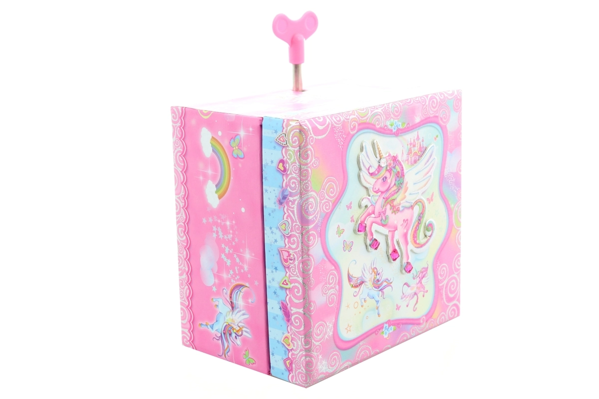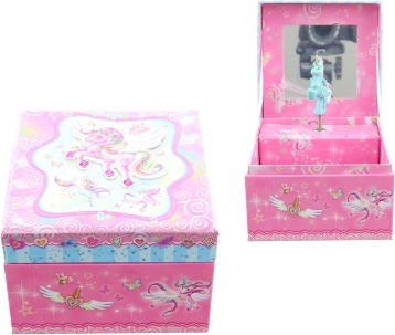 Această cutie muzicală pentru bijuterii, în formă de cufăraș, este ideală pentru păstrarea inelelor, cerceilor și altor mărunțișuri. La deschiderea capacului, datorită învârtirii cheiței, figurina unicorn începe să danseze și se aude o melodie plăcută, care creează o atmosferă de basm. În interior este amplasată o oglindă pentru o verificare rapidă a aspectului.
