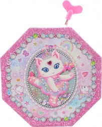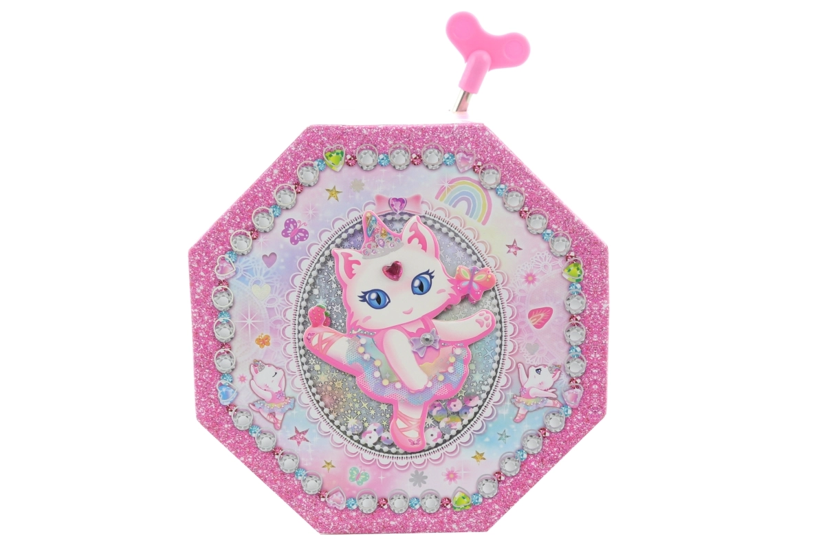 Această elegantă cutie muzicală de bijuterii roz îmbină un design atrăgător cu spațiu de depozitare practic. După întoarcerea cheiței mecanice, balerina se rotește în fața oglinjoarei și pornește o melodie care îți va însenina fiecare deschidere a capacului. Cutia este decorată cu ilustrații drăgălașe cu pisici și unicorni, sclipici și pietricele decorative.