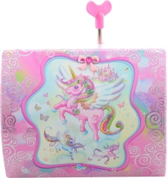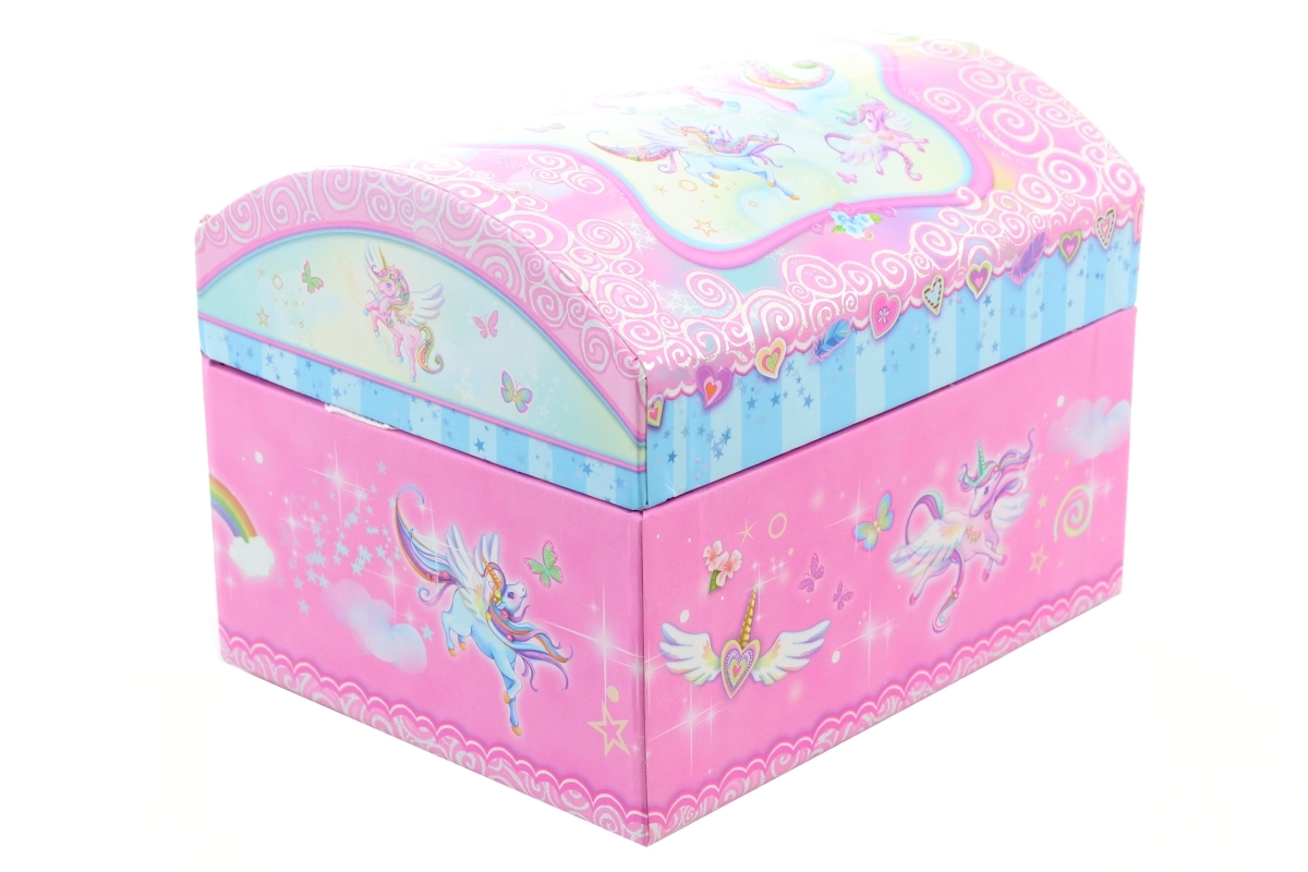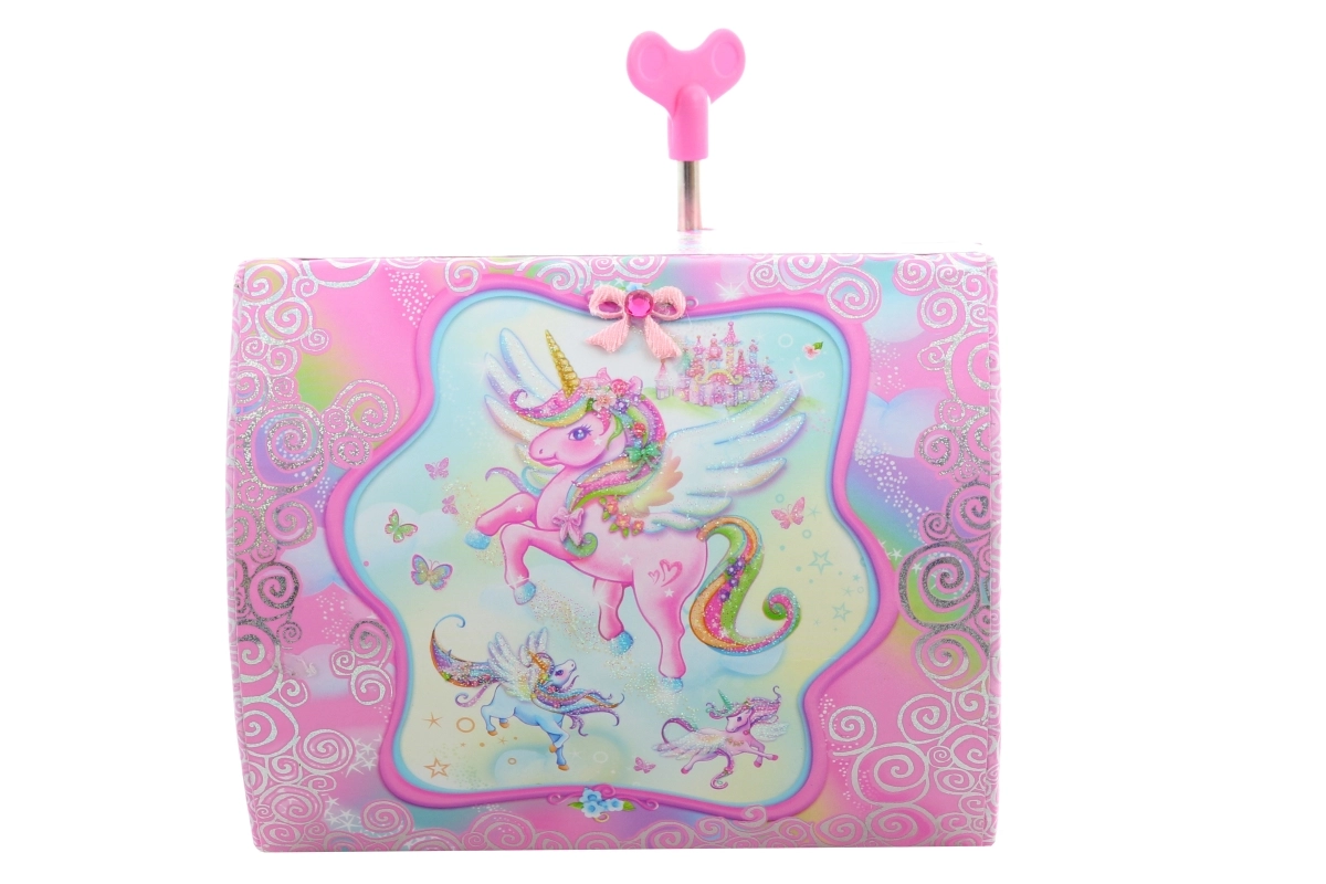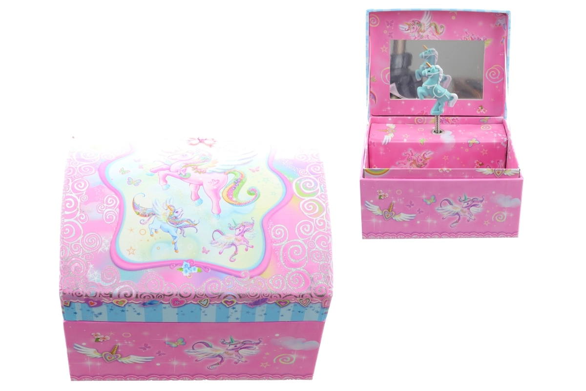 Această cutie de bijuterii roz, cu motiv de unicorni, va încânta orice mică domnișoară. După armarea mecanismului, în interior se învârte o figurină de balerină și se aude o melodie delicată. Include o oglindă interioară și spațiu pentru micile comori. Ideală ca dar și o frumoasă decorațiune pentru camera copiilor. Mecanism muzical, balerină rotativă, oglindă în interior, motiv adorabil cu unicorni.