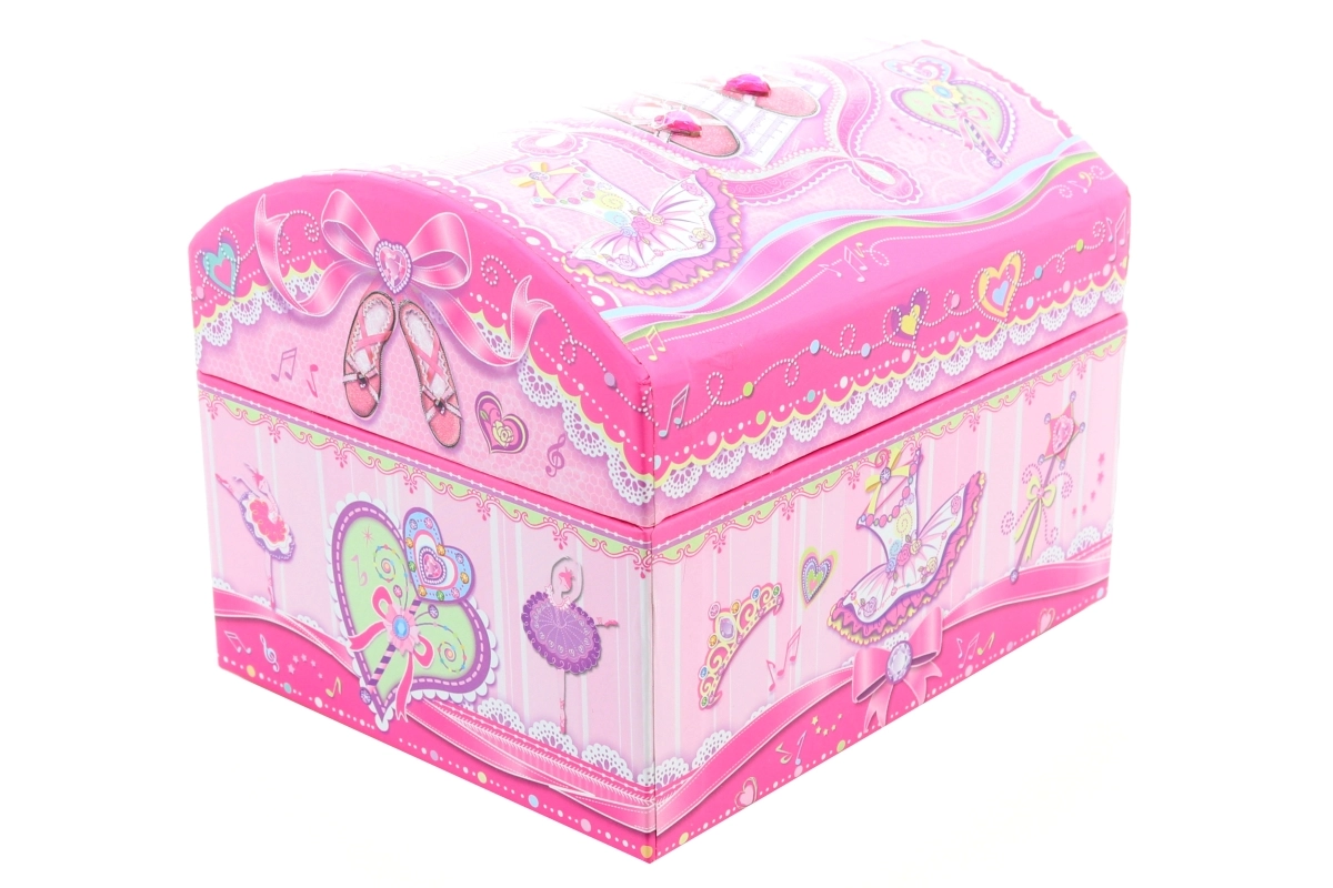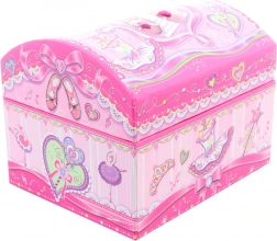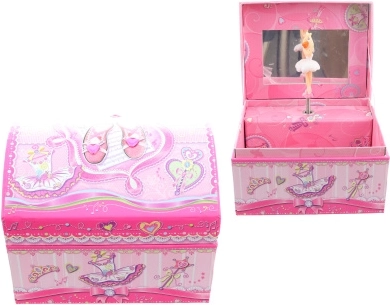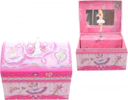 Această delicată cutie pentru bijuterii, în formă de cufăraș, este locul ideal pentru a păstra inele, cercei și alte mărunțișuri. După învârtirea cheiței și deschiderea capacului, figurina balerinei se rotește în fața oglinzii și pornește o melodie care creează o atmosferă de basm.