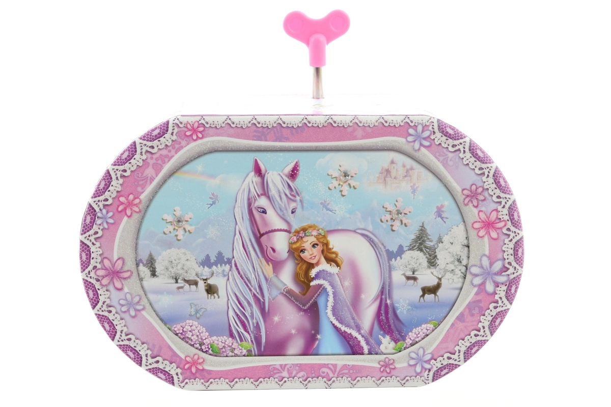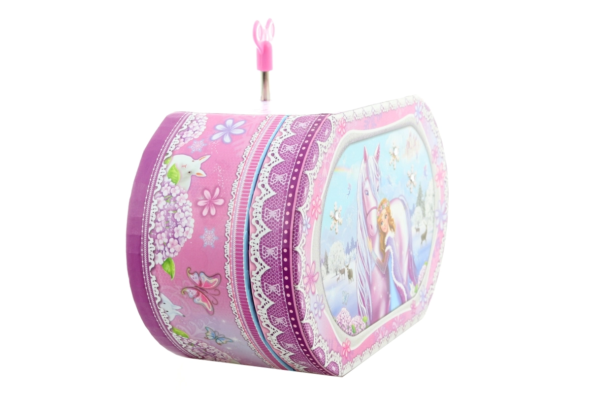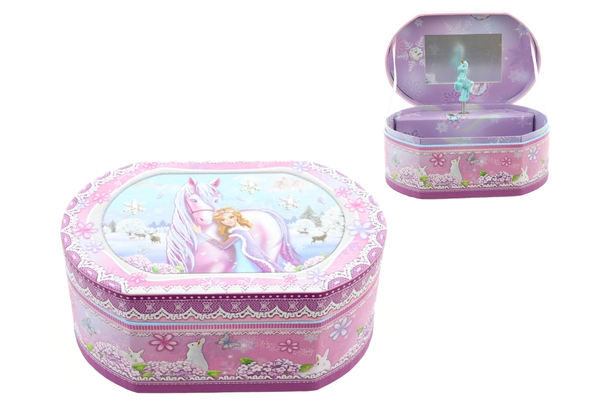 Această delicată cutie muzicală de bijuterii, cu motive de unicorn și prințesă, transformă păstrarea inelelor, cerceilor și micilor comori într-un ritual fermecat. După întoarcerea cheiței, balerina din interior începe să se învârtă, iar o melodie plăcută răsună, în timp ce oglinda integrată ușurează probarea bijuteriilor.