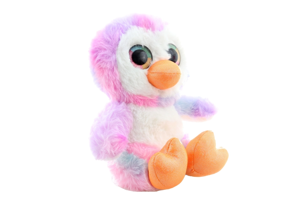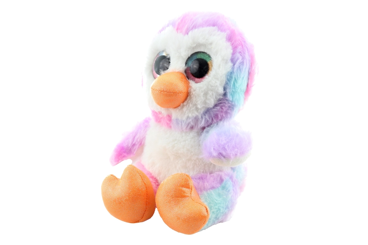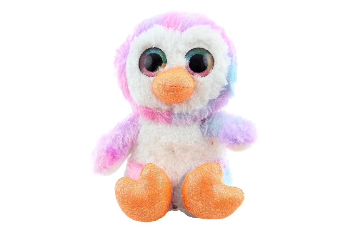Ochii mari, strălucitori și tonurile pastel delicate (roz, mov, albastru și alb) transformă pinguinul într-un accesoriu adorabil pentru camera copilului.