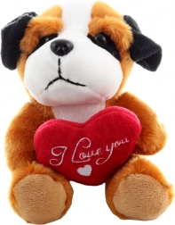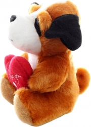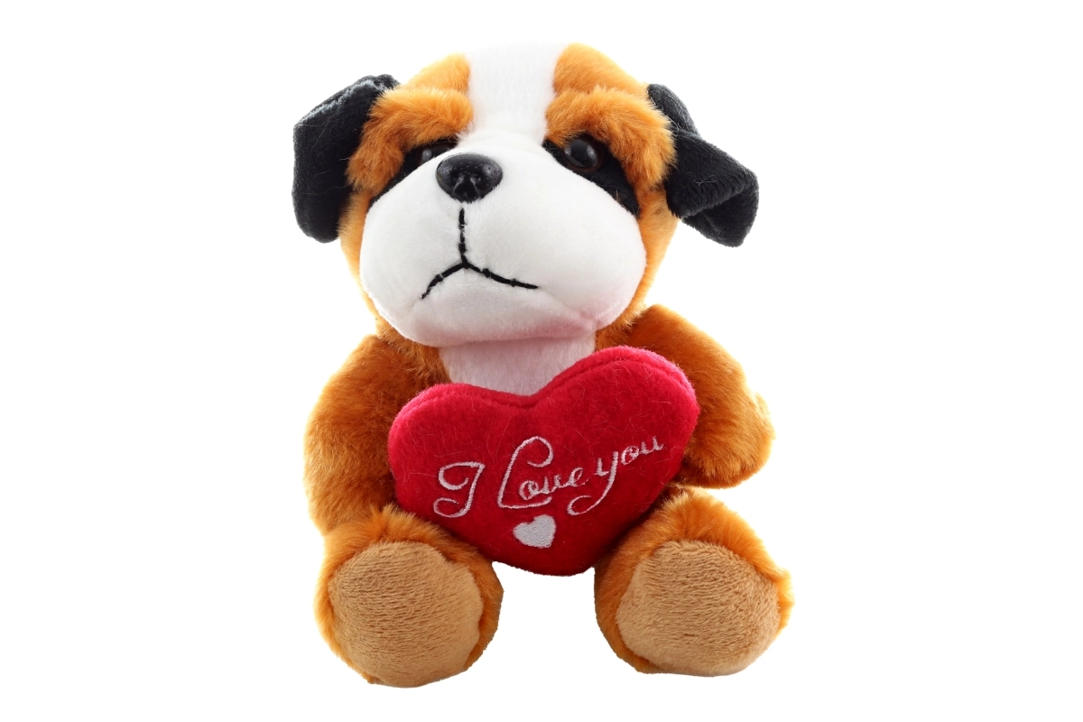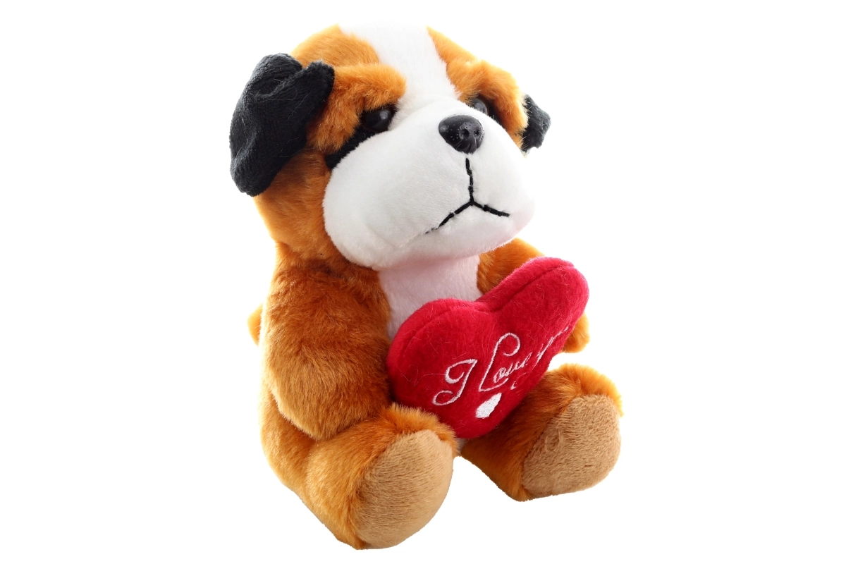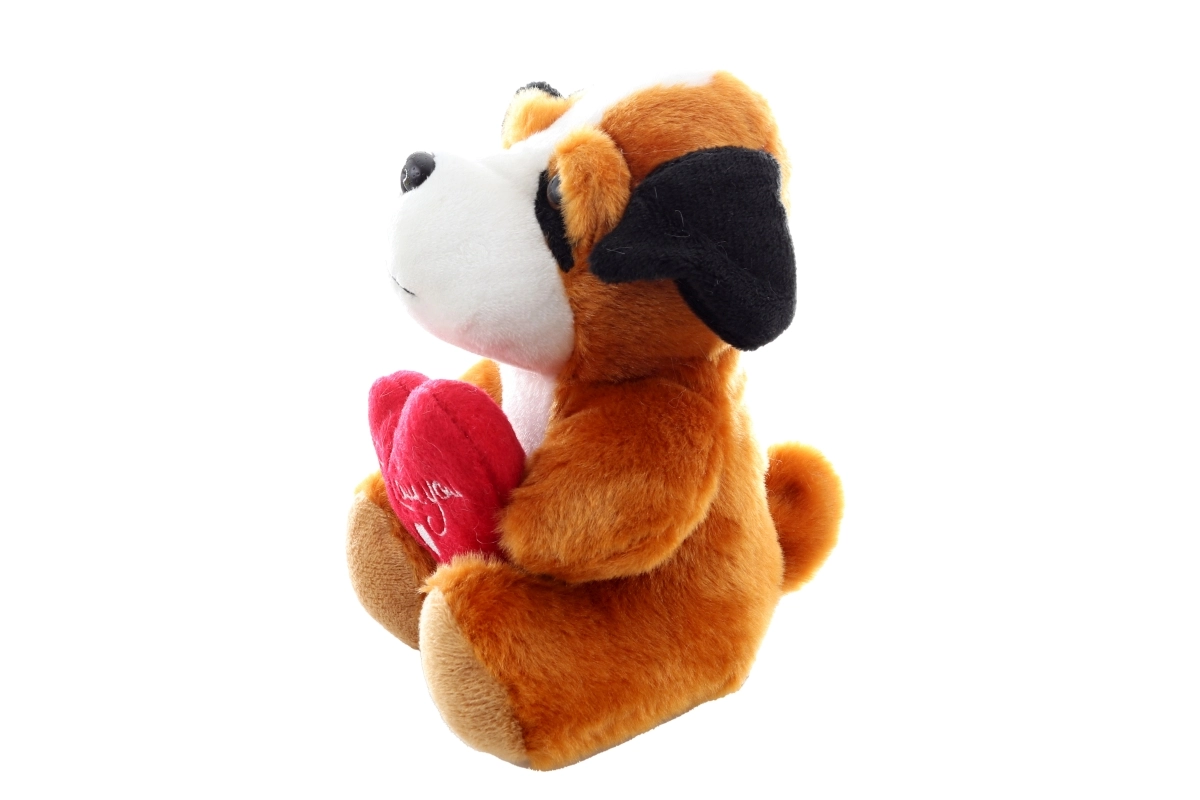 Acest cățeluș de pluș foarte moale, cu inimioară, cucerește imediat inimile copiilor și ale adulților. Combinația de blăniță maro-albă, urechiușe drăgălașe și inimioara roșie cu inscripția „I love you”/„I love U” îl face un cadou perfect pentru Valentine’s Day, zile de naștere sau pur și simplu pentru a aduce bucurie.