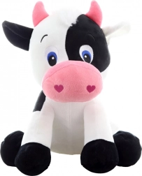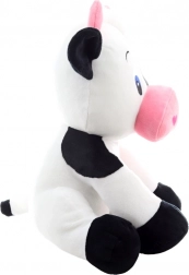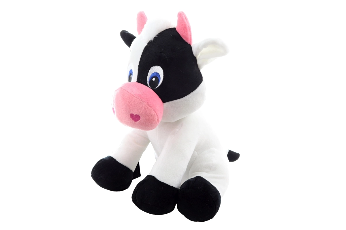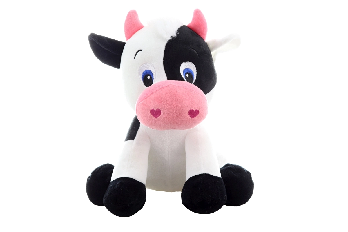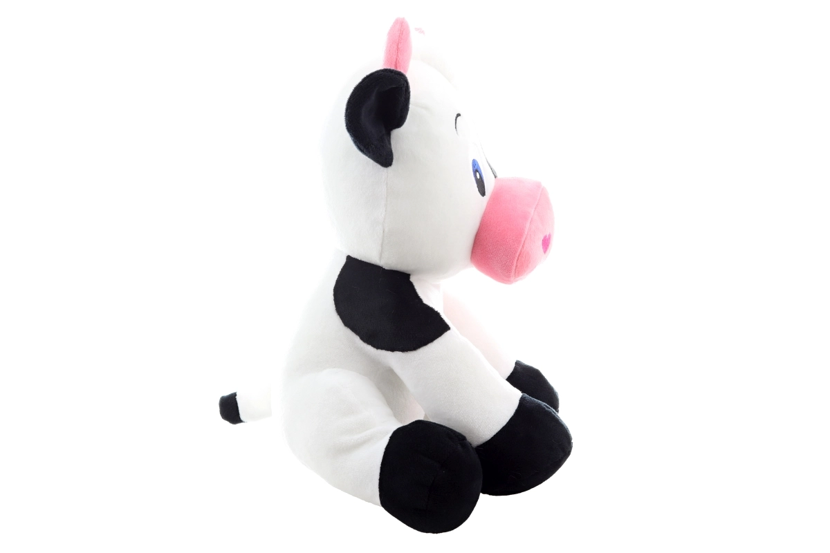 Designul cu pete alb-negre, botic roz și cornițe oferă jucăriei un aspect prietenos. Construcția stabilă în poziție șezând o recomandă și ca decorațiune drăguță pentru camera copilului.