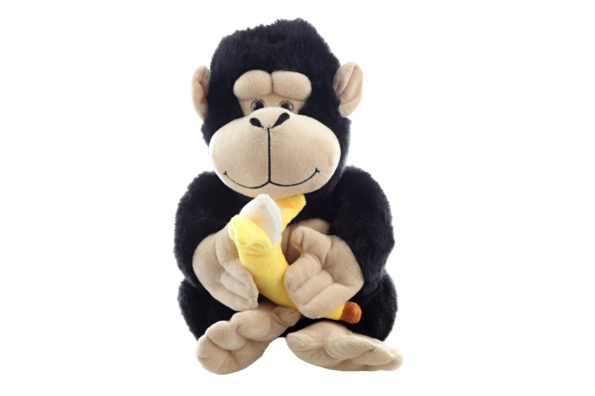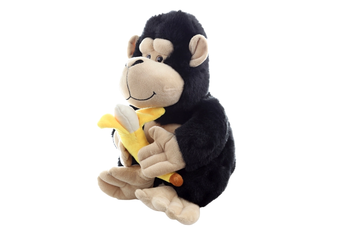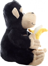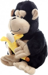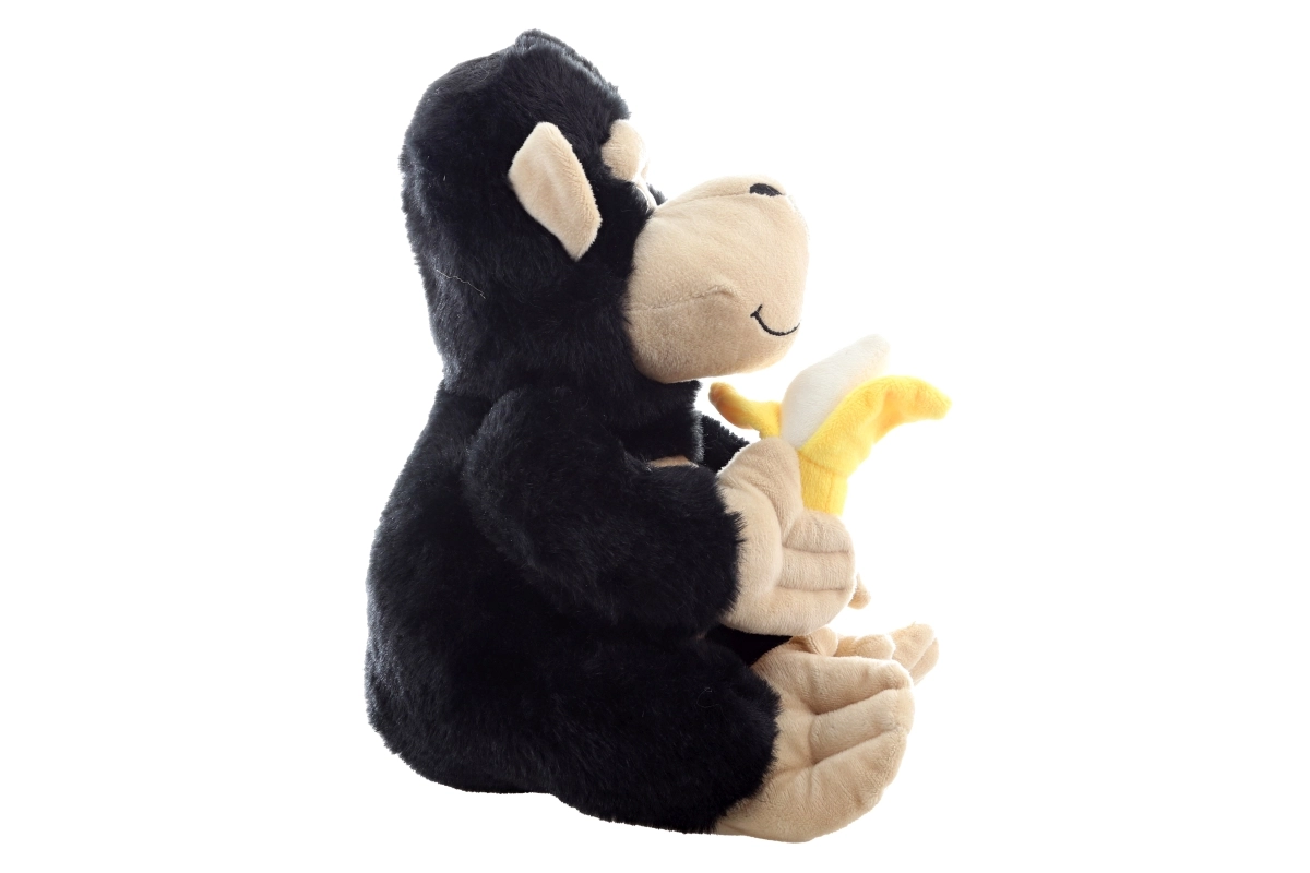 Această gorilă de pluș de 28 cm atrage atenția de la prima vedere prin blănița neagră fină și fața, lăbuțele și tălpile bej contrastante. În lăbuțe ține mândră o banană galbenă, moale – un accesoriu drăgălaș care invită la joacă imaginativă și la povestit.