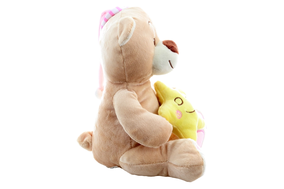 Acest ursuleț catifelat, cu căciuliță roz de dormit și o steluță galbenă delicată în palmă, oferă copiilor un sentiment de siguranță și un somn liniștit. Datorită execuției de calitate și detaliilor brodate, este potrivit și pentru nou-născuți.