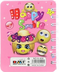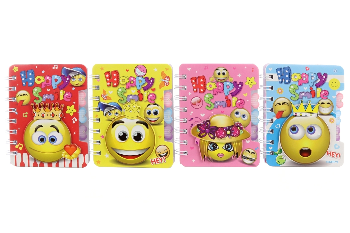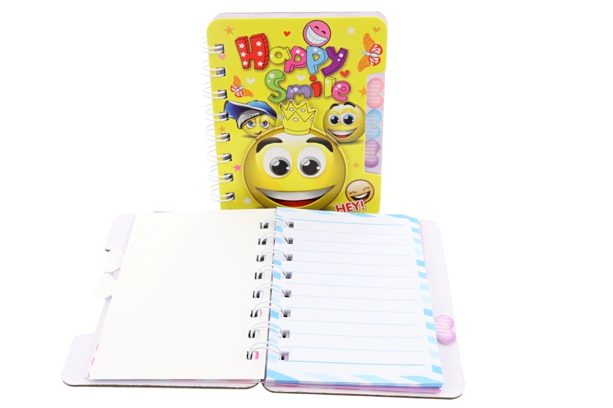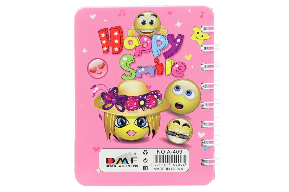 Coperțile cu inscripția „Happy Smile” sunt disponibile în mai multe designuri vesele. Caietul este ambalat în săculeț și este potrivit pentru notițe, liste, jurnal sau schițe rapide. Produsul nu este jucărie.