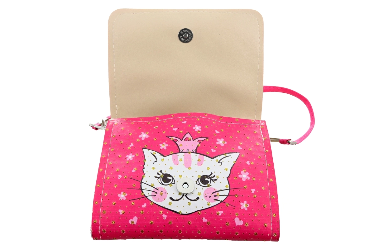 Spațiul interior este inteligent împărțit în 2 compartimente, astfel încât copilul își poate organiza ușor mărunțișurile, precum șervețele, jucării mici sau comori din excursii. Închiderea cu capsă permite o închidere rapidă și sigură, pentru ca conținutul să rămână la locul lui. Culoarea intensă și motivul drăgălaș cu pisicuță atrag din prima privire și sporesc bucuria copiilor de a o purta.