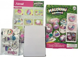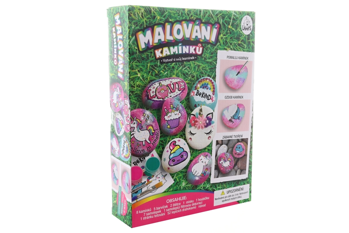 Setul conține 8 pietricele, 5 vopsele, 2 pensule, 52 pietre prețioase autocolante și alte accesorii. Datorită recipientelor de vopsea ușor de închis și tamponului din spumă, lucrul este mai curat și mai precis. Dimensiuni ambalaj aprox. 18 × 25 × 5 cm. Vârstă: 3+.