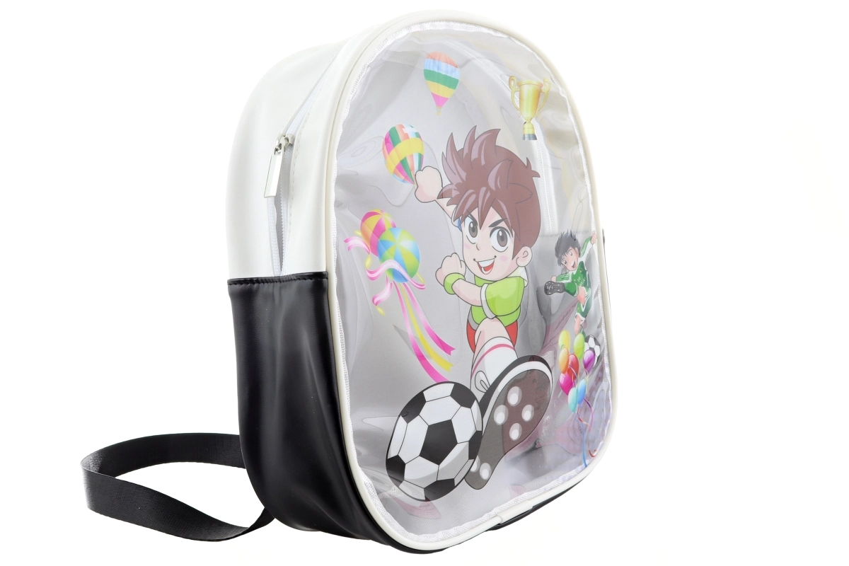 Rucsacul stilat pentru copii cu motiv de fotbalist impresionează prin partea frontală transparentă și execuția rezistentă din combinație de plastic și piele ecologică. Dimensiunile compacte 25,5 × 29 × 8,5 cm sunt ideale pentru excursii, activități sau grădiniță. Ușor și ușor de întreținut, fără bretea toracică.
