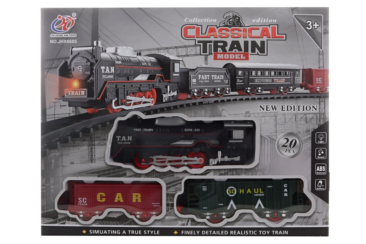 În pachet găsiți tot ce este necesar pentru distracție imediată: locomotivă, 2 vagoane, un set de șine pentru a crea o pistă circulară și autocolante decorative. Alimentarea este asigurată de 2× baterii AA (nu sunt incluse). Întregul set este organizat într-o cutie și, datorită dimensiunilor compacte, se depozitează ușor.